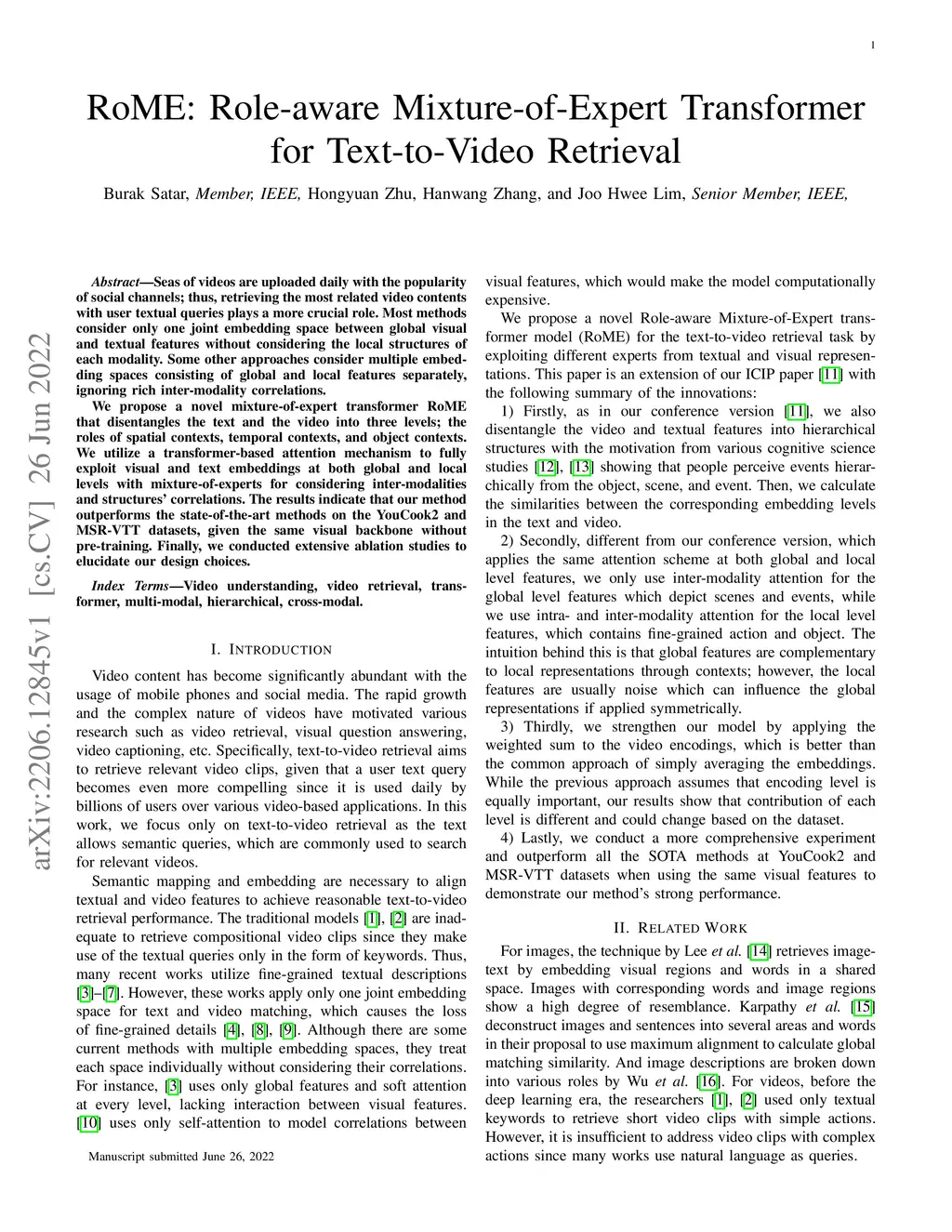 Seas of videos are uploaded daily with the popularity of social channels; thus, retrieving the most related video contents with user textual queries plays a more crucial role. Most methods consider only one joint embedding space between global visual and textual features without considering the local structures of each modality. Some other approaches consider multiple embedding spaces consisting of global and local features separately, ignoring rich inter-modality correlations. We propose a novel mixture-of-expert transformer RoME that disentangles the text and the video into three levels; the roles of spatial contexts, temporal contexts, and object contexts. We utilize a transformer-based attention mechanism to fully exploit visual and text embeddings at both global and local levels with mixture-of-experts for considering inter-modalities and structures' correlations. The results indicate that our method outperforms the state-of-the-art methods on the YouCook2 and MSR-VTT datasets, given the same visual backbone without pre-training. Finally, we conducted extensive ablation studies to elucidate our design choices.