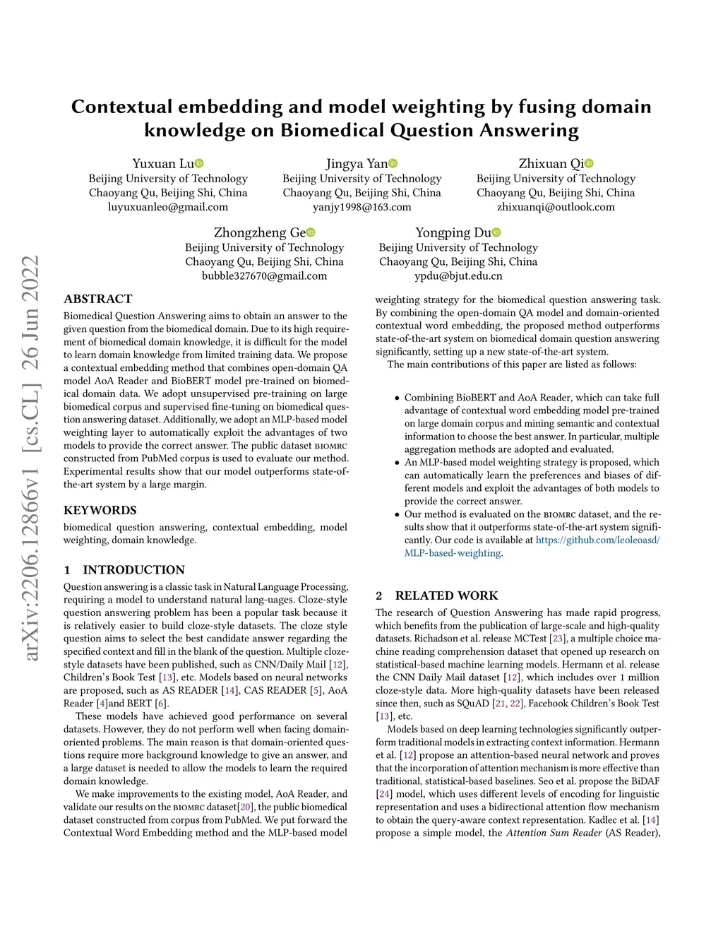 Biomedical Question Answering aims to obtain an answer to the given question from the biomedical domain. Due to its high requirement of biomedical domain knowledge, it is difficult for the model to learn domain knowledge from limited training data. We propose a contextual embedding method that combines open-domain QA model \aoa and \biobert model pre-trained on biomedical domain data. We adopt unsupervised pre-training on large biomedical corpus and supervised fine-tuning on biomedical question answering dataset. Additionally, we adopt an MLP-based model weighting layer to automatically exploit the advantages of two models to provide the correct answer. The public dataset \biomrc constructed from PubMed corpus is used to evaluate our method. Experimental results show that our model outperforms state-of-the-art system by a large margin.