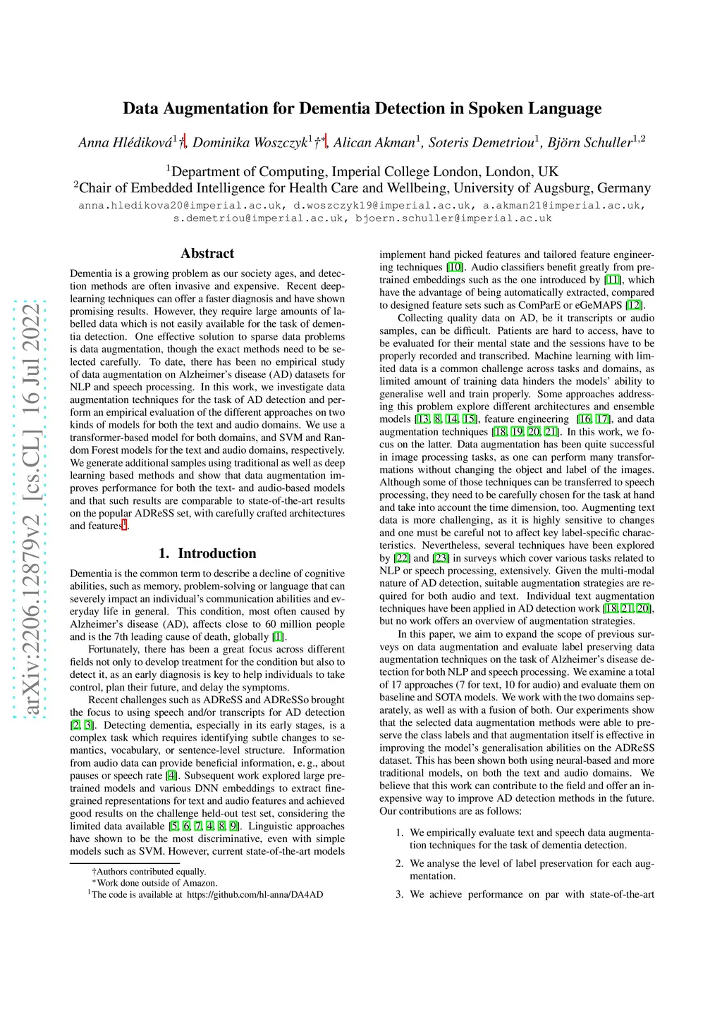 Dementia is a growing problem as our society ages, and detection methods are often invasive and expensive. Recent deep-learning techniques can offer a faster diagnosis and have shown promising results. However, they require large amounts of labelled data which is not easily available for the task of dementia detection. One effective solution to sparse data problems is data augmentation, though the exact methods need to be selected carefully. To date, there has been no empirical study of data augmentation on Alzheimer's disease (AD) datasets for NLP and speech processing. In this work, we investigate data augmentation techniques for the task of AD detection and perform an empirical evaluation of the different approaches on two kinds of models for both the text and audio domains. We use a transformer-based model for both domains, and SVM and Random Forest models for the text and audio domains, respectively. We generate additional samples using traditional as well as deep learning based methods and show that data augmentation improves performance for both the text- and audio-based models and that such results are comparable to state-of-the-art results on the popular ADReSS set, with carefully crafted architectures and features.