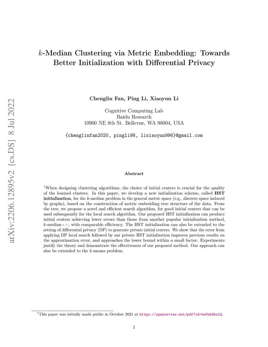 When designing clustering algorithms, the choice of initial centers is crucial for the quality of the learned clusters. In this paper, we develop a new initialization scheme, called HST initialization, for the kk-median problem in the general metric space (e.g., discrete space induced by graphs), based on the construction of metric embedding tree structure of the data. From the tree, we propose a novel and efficient search algorithm, for good initial centers that can be used subsequently for the local search algorithm. Our proposed HST initialization can produce initial centers achieving lower errors than those from another popular initialization method, kk-median++, with comparable efficiency. The HST initialization can also be extended to the setting of differential privacy (DP) to generate private initial centers. We show that the error from applying DP local search followed by our private HST initialization improves previous results on the approximation error, and approaches the lower bound within a small factor. Experiments justify the theory and demonstrate the effectiveness of our proposed method. Our approach can also be extended to the kk-means problem.