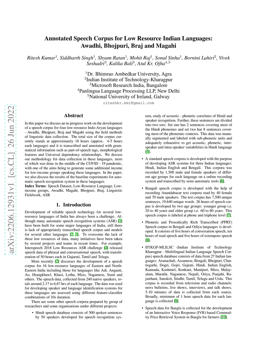 In this paper we discuss an in-progress work on the development of a speech corpus for four low-resource Indo-Aryan languages -- Awadhi, Bhojpuri, Braj and Magahi using the field methods of linguistic data collection. The total size of the corpus currently stands at approximately 18 hours (approx. 4-5 hours each language) and it is transcribed and annotated with grammatical information such as part-of-speech tags, morphological features and Universal dependency relationships. We discuss our methodology for data collection in these languages, most of which was done in the middle of the COVID-19 pandemic, with one of the aims being to generate some additional income for low-income groups speaking these languages. In the paper, we also discuss the results of the baseline experiments for automatic speech recognition system in these languages.
