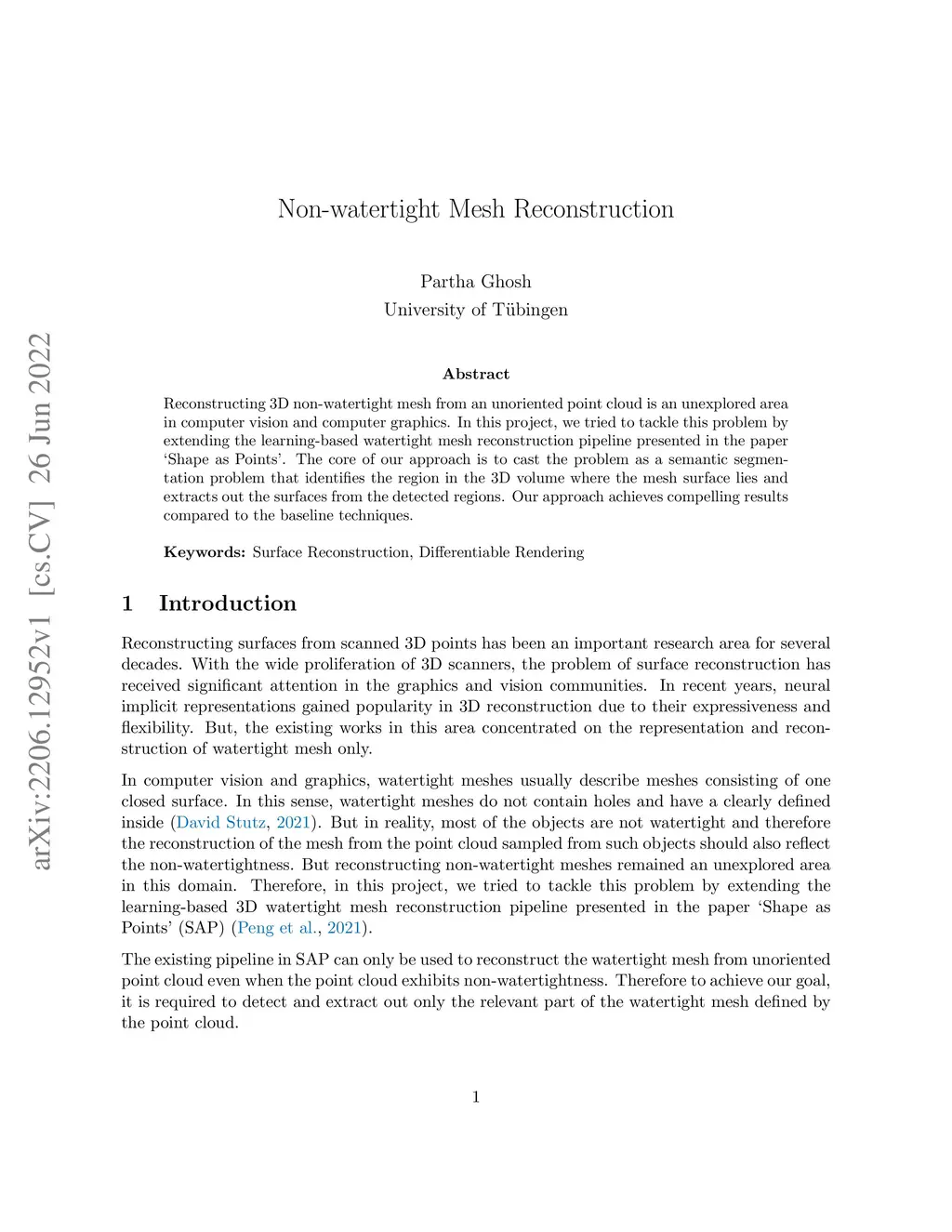 Reconstructing 3D non-watertight mesh from an unoriented point cloud is an unexplored area in computer vision and computer graphics. In this project, we tried to tackle this problem by extending the learning-based watertight mesh reconstruction pipeline presented in the paper 'Shape as Points'. The core of our approach is to cast the problem as a semantic segmentation problem that identifies the region in the 3D volume where the mesh surface lies and extracts the surfaces from the detected regions. Our approach achieves compelling results compared to the baseline techniques.