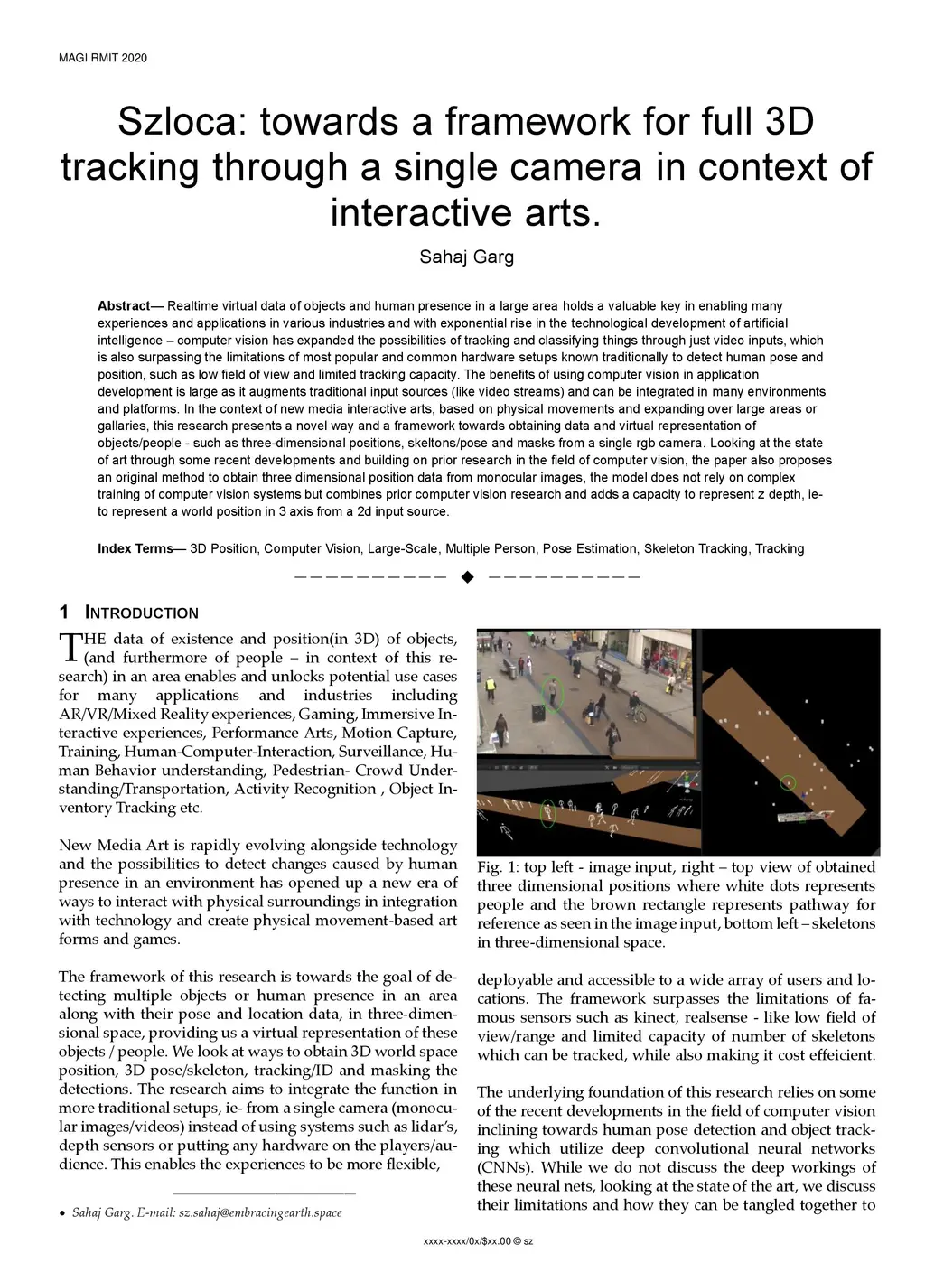 Realtime virtual data of objects and human presence in a large area holds a valuable key in enabling many experiences and applications in various industries and with exponential rise in the technological development of artificial intelligence, computer vision has expanded the possibilities of tracking and classifying things through just video inputs, which is also surpassing the limitations of most popular and common hardware setups known traditionally to detect human pose and position, such as low field of view and limited tracking capacity. The benefits of using computer vision in application development is large as it augments traditional input sources (like video streams) and can be integrated in many environments and platforms. In the context of new media interactive arts, based on physical movements and expanding over large areas or gallaries, this research presents a novel way and a framework towards obtaining data and virtual representation of objects/people - such as three-dimensional positions, skeltons/pose and masks from a single rgb camera. Looking at the state of art through some recent developments and building on prior research in the field of computer vision, the paper also proposes an original method to obtain three dimensional position data from monocular images, the model does not rely on complex training of computer vision systems but combines prior computer vision research and adds a capacity to represent z depth, ieto represent a world position in 3 axis from a 2d input source.