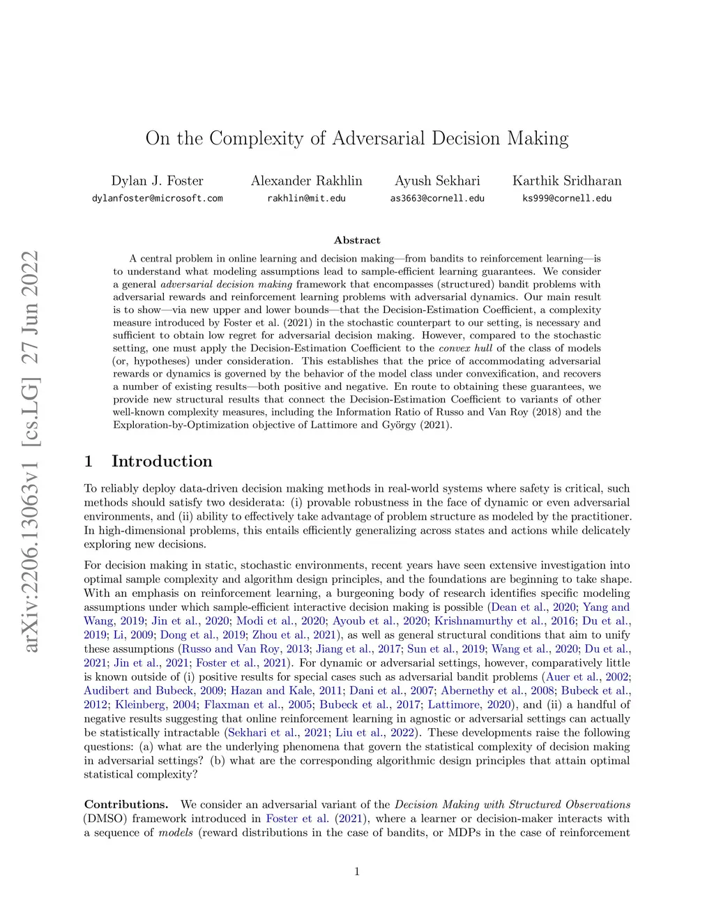 A central problem in online learning and decision making -- from bandits to reinforcement learning -- is to understand what modeling assumptions lead to sample-efficient learning guarantees. We consider a general adversarial decision making framework that encompasses (structured) bandit problems with adversarial rewards and reinforcement learning problems with adversarial dynamics. Our main result is to show -- via new upper and lower bounds -- that the Decision-Estimation Coefficient, a complexity measure introduced by Foster et al. in the stochastic counterpart to our setting, is necessary and sufficient to obtain low regret for adversarial decision making. However, compared to the stochastic setting, one must apply the Decision-Estimation Coefficient to the convex hull of the class of models (or, hypotheses) under consideration. This establishes that the price of accommodating adversarial rewards or dynamics is governed by the behavior of the model class under convexification, and recovers a number of existing results -- both positive and negative. En route to obtaining these guarantees, we provide new structural results that connect the Decision-Estimation Coefficient to variants of other well-known complexity measures, including the Information Ratio of Russo and Van Roy and the Exploration-by-Optimization objective of Lattimore and Gy\"{o}rgy.