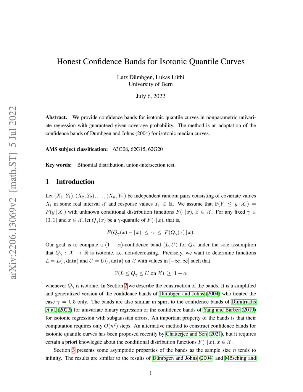 We provide confidence bands for isotonic quantile curves in nonparametric univariate regression with guaranteed given coverage probability. The method is an adaptation of the confidence bands of Duembgen and Johns (2004) for isotonic median curves.