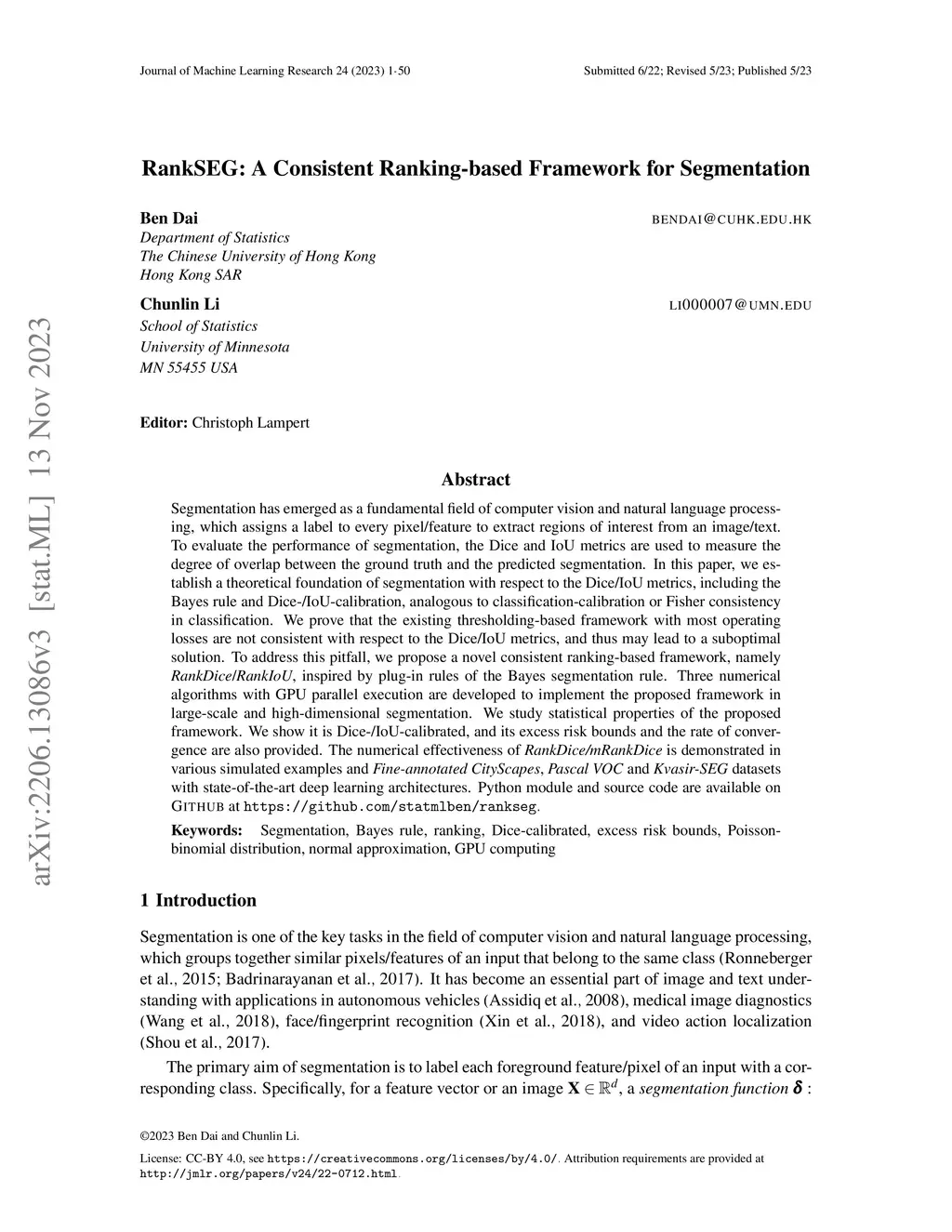 Segmentation has emerged as a fundamental field of computer vision and natural language processing, which assigns a label to every pixel/feature to extract regions of interest from an image/text. To evaluate the performance of segmentation, the Dice and IoU metrics are used to measure the degree of overlap between the ground truth and the predicted segmentation. In this paper, we establish a theoretical foundation of segmentation with respect to the Dice/IoU metrics, including the Bayes rule and Dice-/IoU-calibration, analogous to classification-calibration or Fisher consistency in classification. We prove that the existing thresholding-based framework with most operating losses are not consistent with respect to the Dice/IoU metrics, and thus may lead to a suboptimal solution. To address this pitfall, we propose a novel consistent ranking-based framework, namely RankDice/RankIoU, inspired by plug-in rules of the Bayes segmentation rule. Three numerical algorithms with GPU parallel execution are developed to implement the proposed framework in large-scale and high-dimensional segmentation. We study statistical properties of the proposed framework. We show it is Dice-/IoU-calibrated, and its excess risk bounds and the rate of convergence are also provided. The numerical effectiveness of RankDice/mRankDice is demonstrated in various simulated examples and Fine-annotated CityScapes, Pascal VOC and Kvasir-SEG datasets with state-of-the-art deep learning architectures.