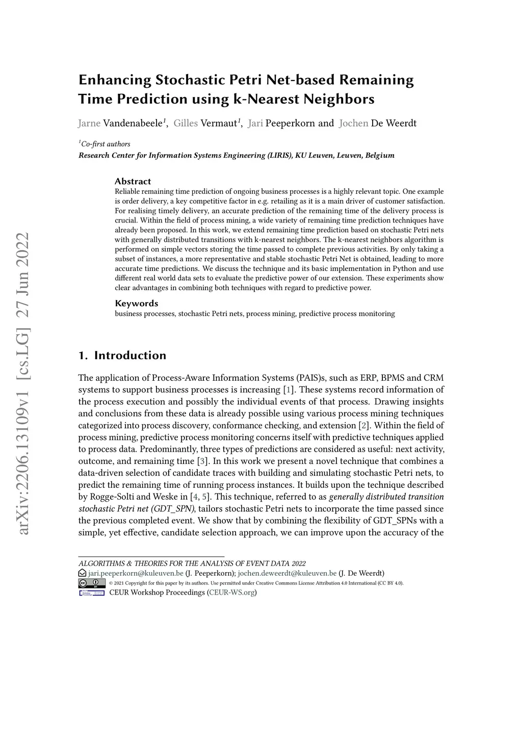 Reliable remaining time prediction of ongoing business processes is a highly relevant topic. One example is order delivery, a key competitive factor in e.g. retailing as it is a main driver of customer satisfaction. For realising timely delivery, an accurate prediction of the remaining time of the delivery process is crucial. Within the field of process mining, a wide variety of remaining time prediction techniques have already been proposed. In this work, we extend remaining time prediction based on stochastic Petri nets with generally distributed transitions with k-nearest neighbors. The k-nearest neighbors algorithm is performed on simple vectors storing the time passed to complete previous activities. By only taking a subset of instances, a more representative and stable stochastic Petri Net is obtained, leading to more accurate time predictions. We discuss the technique and its basic implementation in Python and use different real world data sets to evaluate the predictive power of our extension. These experiments show clear advantages in combining both techniques with regard to predictive power.