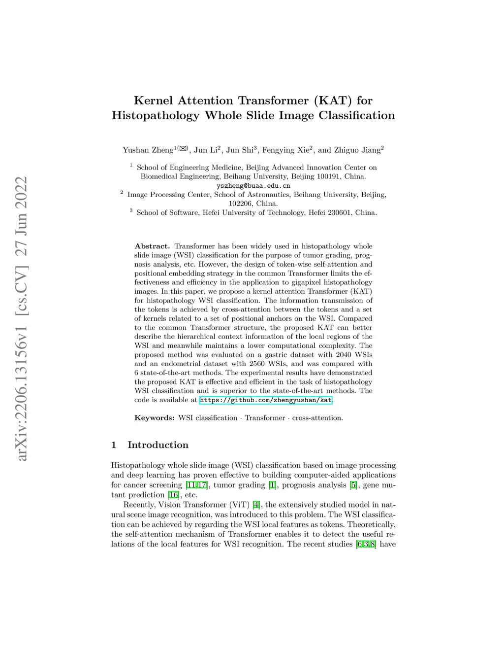 Kernel Attention Transformer (KAT) for Histopathology Whole Slide Image