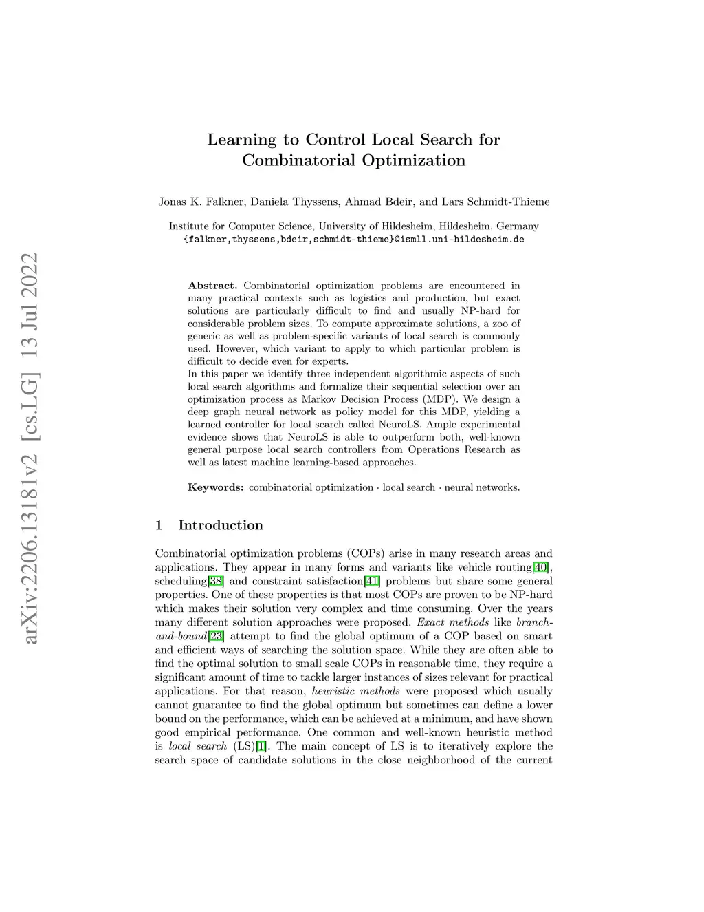 Combinatorial optimization problems are encountered in many practical contexts such as logistics and production, but exact solutions are particularly difficult to find and usually NP-hard for considerable problem sizes. To compute approximate solutions, a zoo of generic as well as problem-specific variants of local search is commonly used. However, which variant to apply to which particular problem is difficult to decide even for experts. In this paper we identify three independent algorithmic aspects of such local search algorithms and formalize their sequential selection over an optimization process as Markov Decision Process (MDP). We design a deep graph neural network as policy model for this MDP, yielding a learned controller for local search called NeuroLS. Ample experimental evidence shows that NeuroLS is able to outperform both, well-known general purpose local search controllers from Operations Research as well as latest machine learning-based approaches.