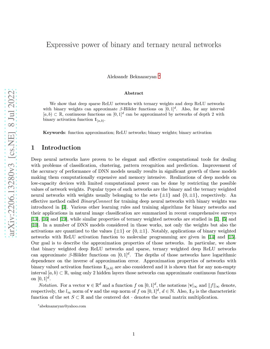 We show that deep sparse ReLU networks with ternary weights and deep ReLU networks with binary weights can approximate -H\"older functions on . Also, for any interval , continuous functions on can be approximated by networks of depth with binary activation function .