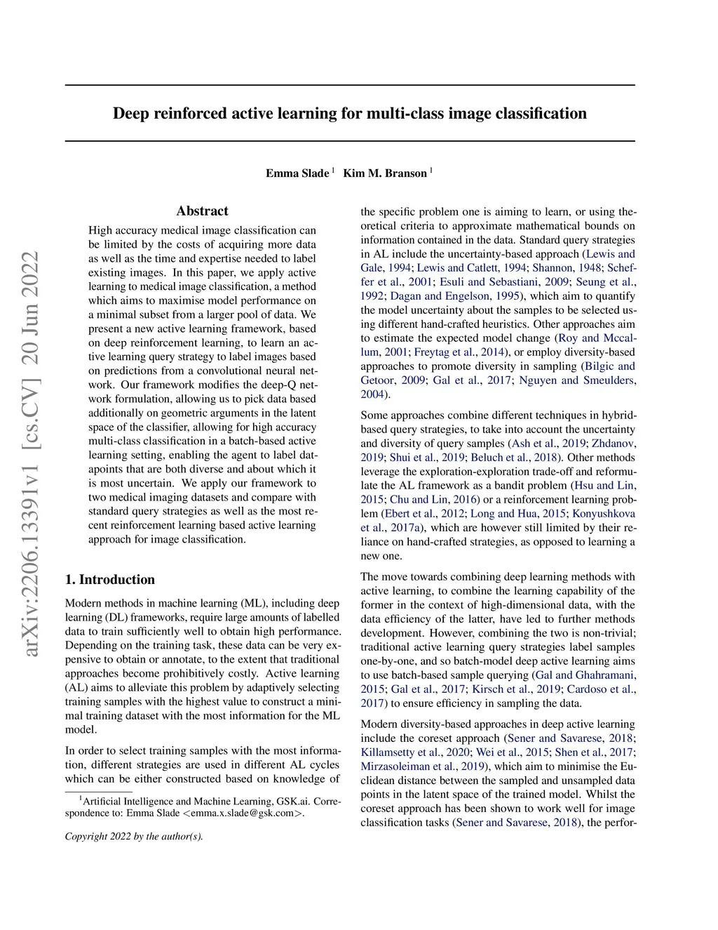 High accuracy medical image classification can be limited by the costs of acquiring more data as well as the time and expertise needed to label existing images. In this paper, we apply active learning to medical image classification, a method which aims to maximise model performance on a minimal subset from a larger pool of data. We present a new active learning framework, based on deep reinforcement learning, to learn an active learning query strategy to label images based on predictions from a convolutional neural network. Our framework modifies the deep-Q network formulation, allowing us to pick data based additionally on geometric arguments in the latent space of the classifier, allowing for high accuracy multi-class classification in a batch-based active learning setting, enabling the agent to label datapoints that are both diverse and about which it is most uncertain. We apply our framework to two medical imaging datasets and compare with standard query strategies as well as the most recent reinforcement learning based active learning approach for image classification.