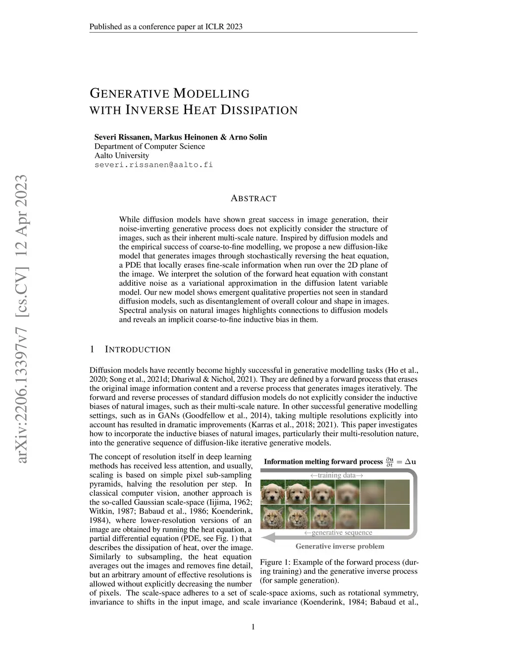 While diffusion models have shown great success in image generation, their noise-inverting generative process does not explicitly consider the structure of images, such as their inherent multi-scale nature. Inspired by diffusion models and the desirability of coarse-to-fine modelling, we propose a new model that generates images through iteratively inverting the heat equation, a PDE that locally erases fine-scale information when run over the 2D plane of the image. In our novel methodology, the solution of the forward heat equation is interpreted as a variational approximation in a directed graphical model. We demonstrate promising image quality and point out emergent qualitative properties not seen in diffusion models, such as disentanglement of overall colour and shape in images and aspects of neural network interpretability. Spectral analysis on natural images positions our model as a type of dual to diffusion models and reveals implicit inductive biases in them.