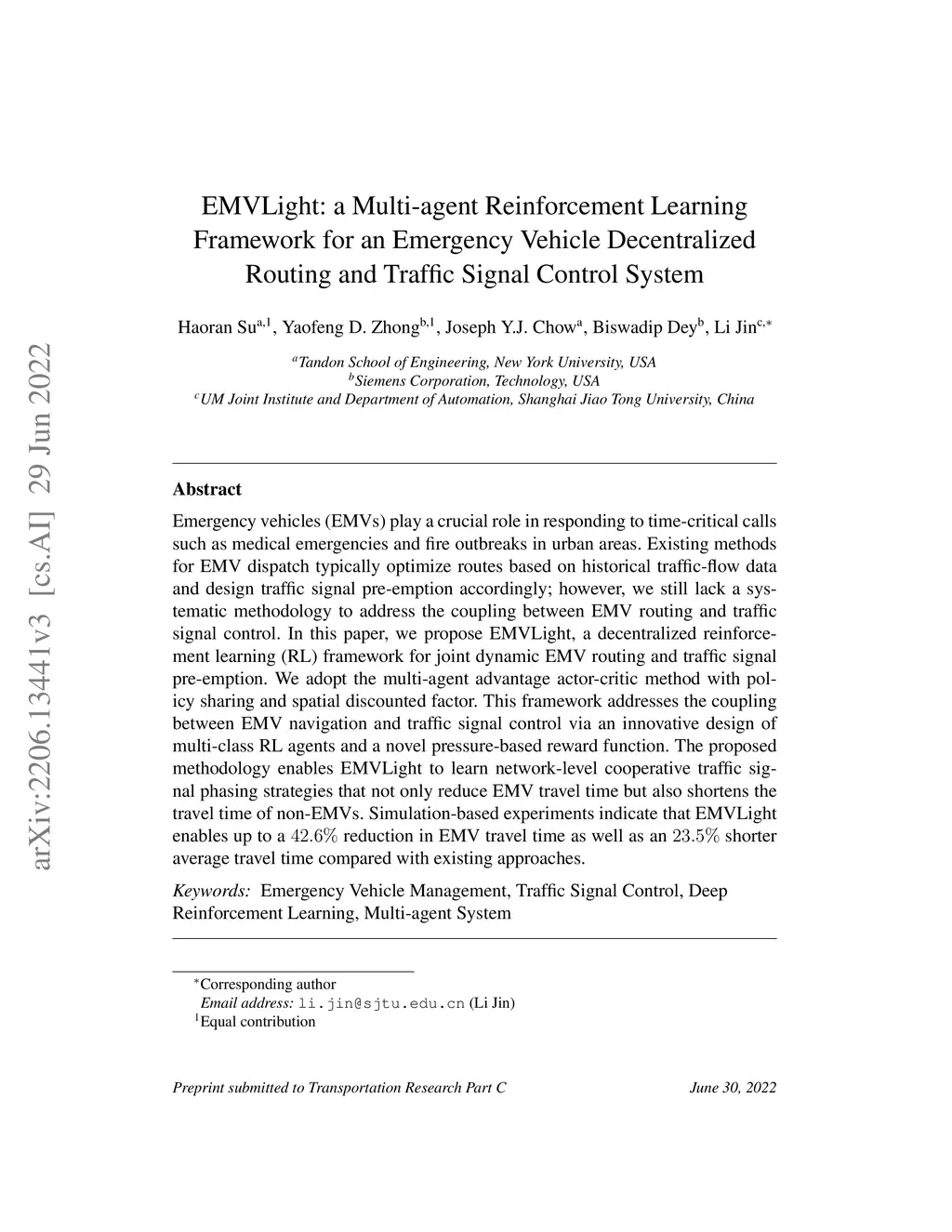 EMVLight: a Multi-agent Reinforcement Learning Framework for an