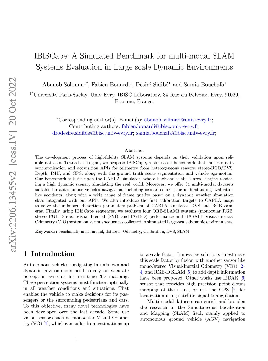 The development process of high-fidelity SLAM systems depends on their validation upon reliable datasets. Towards this goal, we propose IBISCape, a simulated benchmark that includes data synchronization and acquisition APIs for telemetry from heterogeneous sensors: stereo-RGB/DVS, Depth, IMU, and GPS, along with the ground truth scene segmentation and vehicle ego-motion. Our benchmark is built upon the CARLA simulator, whose back-end is the Unreal Engine rendering a high dynamic scenery simulating the real world. Moreover, we offer 34 multi-modal datasets suitable for autonomous vehicles navigation, including scenarios for scene understanding evaluation like accidents, along with a wide range of frame quality based on a dynamic weather simulation class integrated with our APIs. We also introduce the first calibration targets to CARLA maps to solve the unknown distortion parameters problem of CARLA simulated DVS and RGB cameras. Finally, using IBISCape sequences, we evaluate four ORB-SLAM3 systems (monocular RGB, stereo RGB, Stereo Visual Inertial (SVI), and RGB-D) performance and BASALT Visual-Inertial Odometry (VIO) system on various sequences collected in simulated large-scale dynamic environments. Keywords: benchmark, multi-modal, datasets, Odometry, Calibration, DVS, SLAM