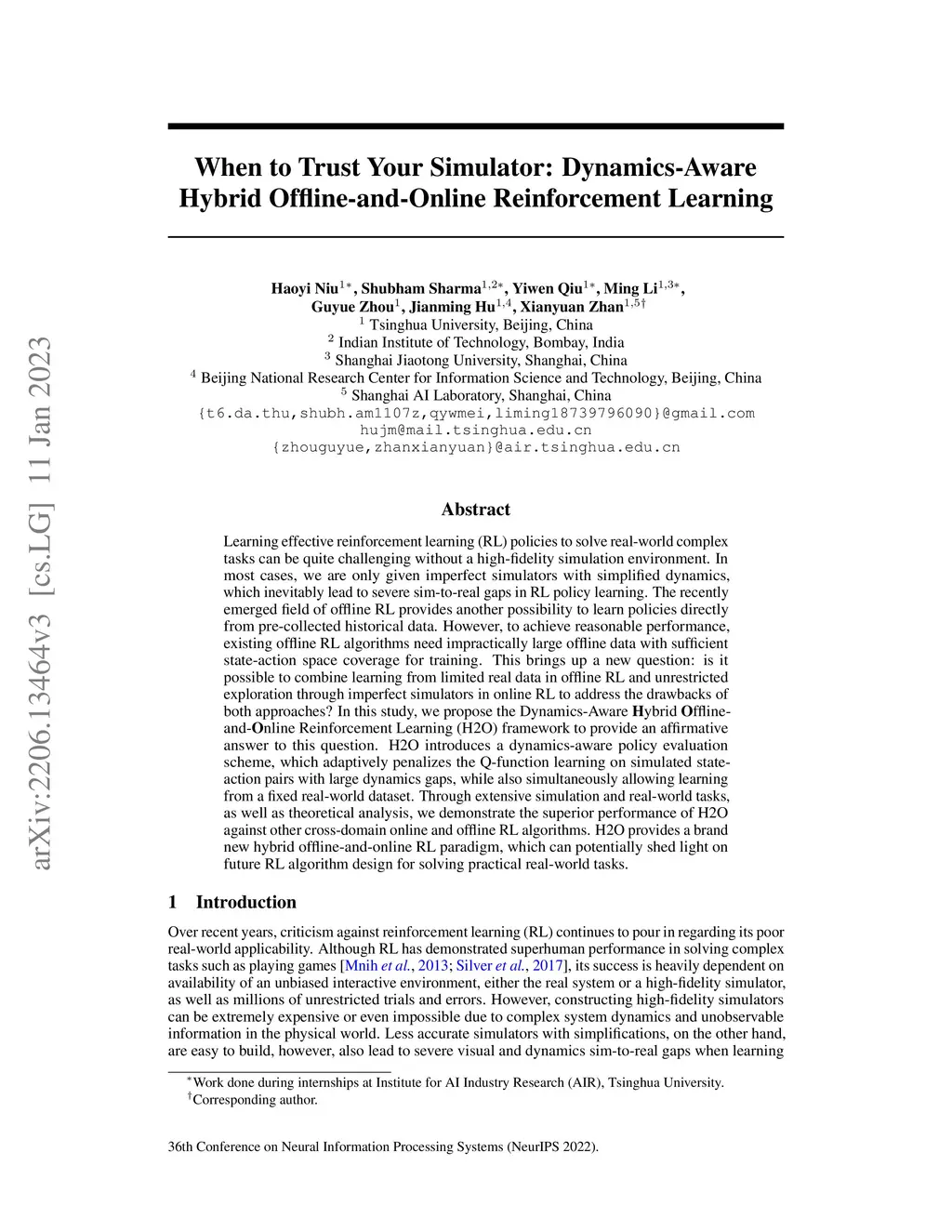 Learning effective reinforcement learning (RL) policies to solve real-world complex tasks can be quite challenging without a high-fidelity simulation environment. In most cases, we are only given imperfect simulators with simplified dynamics, which inevitably lead to severe sim-to-real gaps in RL policy learning. The recently emerged field of offline RL provides another possibility to learn policies directly from pre-collected historical data. However, to achieve reasonable performance, existing offline RL algorithms need impractically large offline data with sufficient state-action space coverage for training. This brings up a new question: is it possible to combine learning from limited real data in offline RL and unrestricted exploration through imperfect simulators in online RL to address the drawbacks of both approaches? In this study, we propose the Dynamics-Aware Hybrid Offline-and-Online Reinforcement Learning (H2O) framework to provide an affirmative answer to this question. H2O introduces a dynamics-aware policy evaluation scheme, which adaptively penalizes the Q function learning on simulated state-action pairs with large dynamics gaps, while also simultaneously allowing learning from a fixed real-world dataset. Through extensive simulation and real-world tasks, as well as theoretical analysis, we demonstrate the superior performance of H2O against other cross-domain online and offline RL algorithms. H2O provides a brand new hybrid offline-and-online RL paradigm, which can potentially shed light on future RL algorithm design for solving practical real-world tasks.