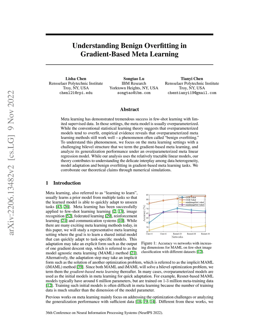 Meta learning has demonstrated tremendous success in few-shot learning with limited supervised data. In those settings, the meta model is usually overparameterized. While the conventional statistical learning theory suggests that overparameterized models tend to overfit, empirical evidence reveals that overparameterized meta learning methods still work well -- a phenomenon often called "benign overfitting." To understand this phenomenon, we focus on the meta learning settings with a challenging bilevel structure that we term the gradient-based meta learning, and analyze its generalization performance under an overparameterized meta linear regression model. While our analysis uses the relatively tractable linear models, our theory contributes to understanding the delicate interplay among data heterogeneity, model adaptation and benign overfitting in gradient-based meta learning tasks. We corroborate our theoretical claims through numerical simulations.