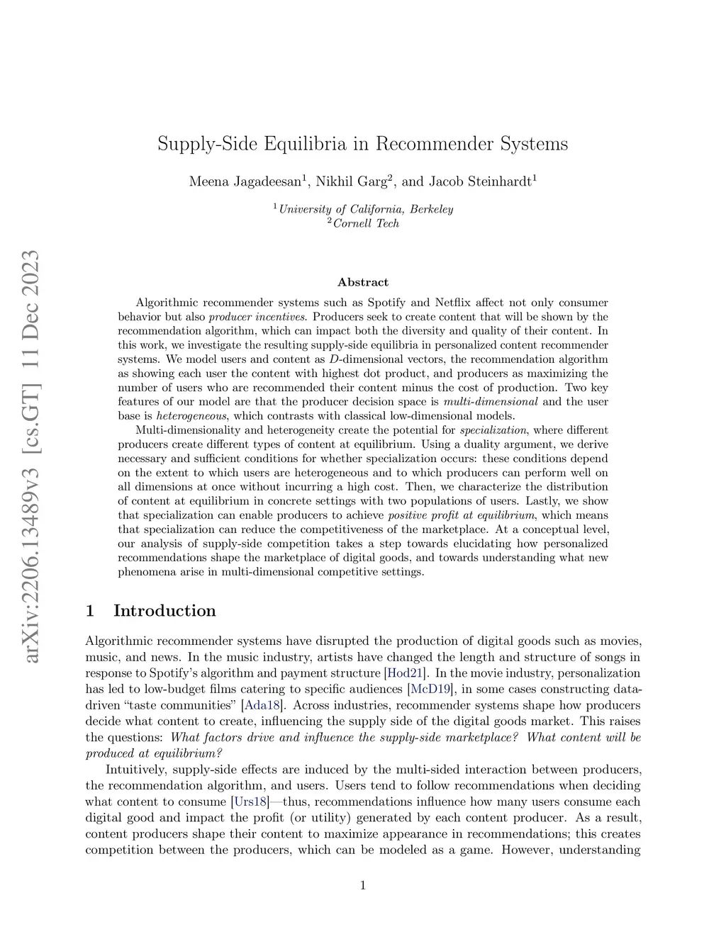 Algorithmic recommender systems such as Spotify and Netflix affect not only consumer behavior but also producer incentives. Producers seek to create content that will be shown by the recommendation algorithm, which can impact both the diversity and quality of their content. In this work, we investigate the resulting supply-side equilibria in personalized content recommender systems. We model users and content as -dimensional vectors, the recommendation algorithm as showing each user the content with highest dot product, and producers as maximizing the number of users who are recommended their content minus the cost of production. Two key features of our model are that the producer decision space is multi-dimensional and the user base is heterogeneous, which contrasts with classical low-dimensional models. Multi-dimensionality and heterogeneity create the potential for specialization, where different producers create different types of content at equilibrium. Using a duality argument, we derive necessary and sufficient conditions for whether specialization occurs: these conditions depend on the extent to which users are heterogeneous and to which producers can perform well on all dimensions at once without incurring a high cost. Then, we characterize the distribution of content at equilibrium in concrete settings with two populations of users. Lastly, we show that specialization can enable producers to achieve positive profit at equilibrium, which means that specialization can reduce the competitiveness of the marketplace. At a conceptual level, our analysis of supply-side competition takes a step towards elucidating how personalized recommendations shape the marketplace of digital goods, and towards understanding what new phenomena arise in multi-dimensional competitive settings.