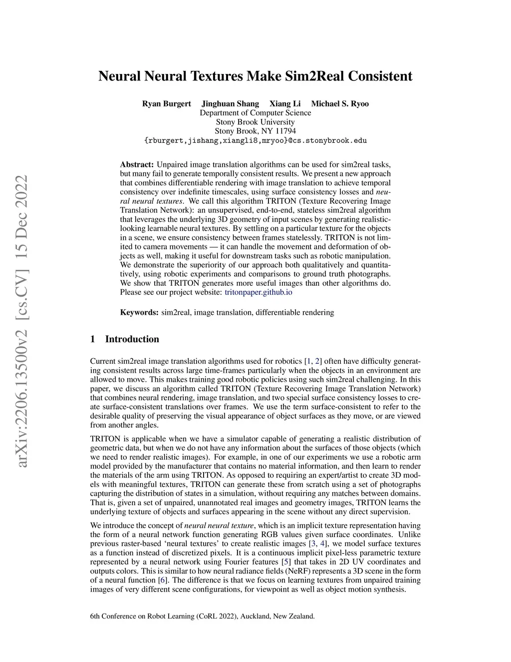 Unpaired image translation algorithms can be used for sim2real tasks, but many fail to generate temporally consistent results. We present a new approach that combines differentiable rendering with image translation to achieve temporal consistency over indefinite timescales, using surface consistency losses and \emph{neural neural textures}. We call this algorithm TRITON (Texture Recovering Image Translation Network): an unsupervised, end-to-end, stateless sim2real algorithm that leverages the underlying 3D geometry of input scenes by generating realistic-looking learnable neural textures. By settling on a particular texture for the objects in a scene, we ensure consistency between frames statelessly. Unlike previous algorithms, TRITON is not limited to camera movements -- it can handle the movement of objects as well, making it useful for downstream tasks such as robotic manipulation.