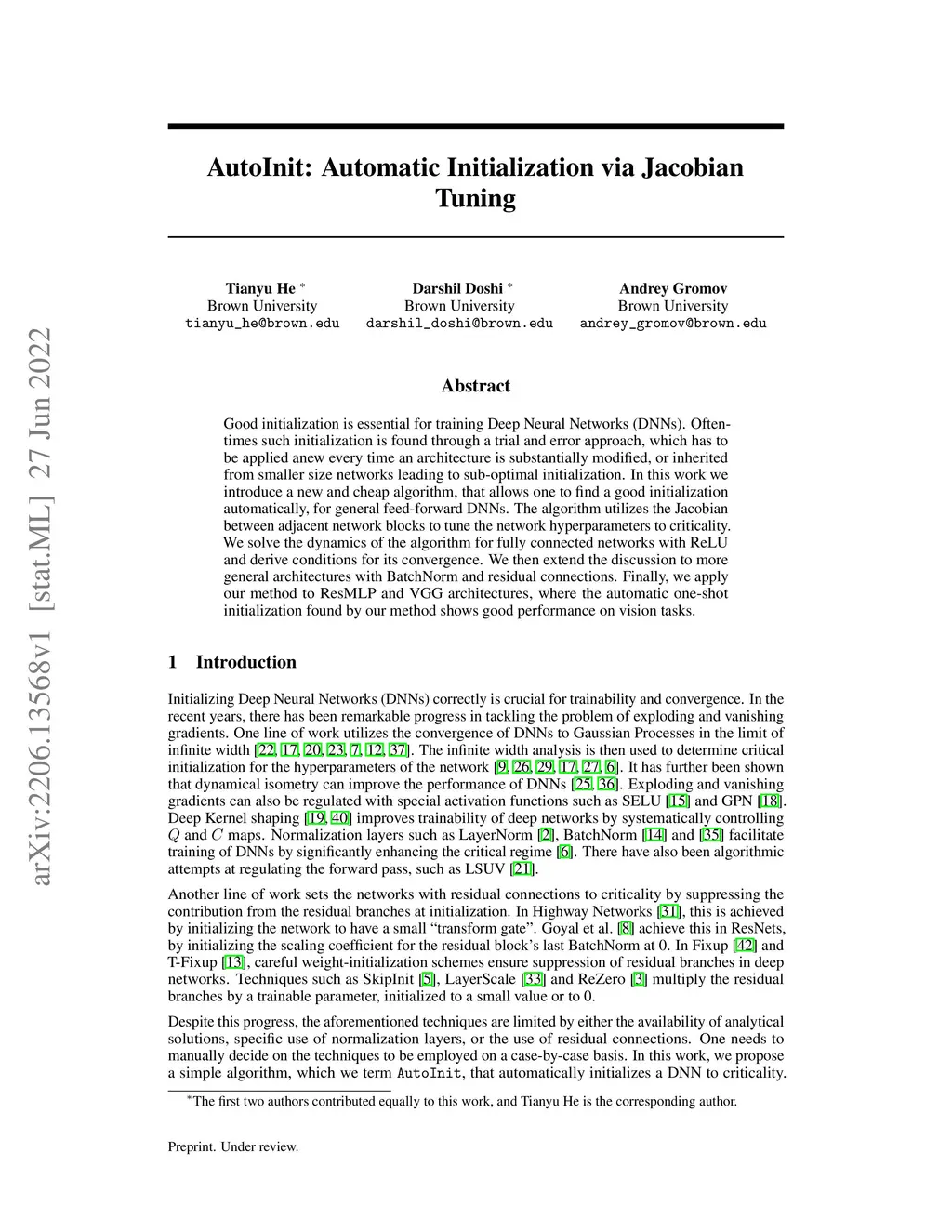 Good initialization is essential for training Deep Neural Networks (DNNs). Oftentimes such initialization is found through a trial and error approach, which has to be applied anew every time an architecture is substantially modified, or inherited from smaller size networks leading to sub-optimal initialization. In this work we introduce a new and cheap algorithm, that allows one to find a good initialization automatically, for general feed-forward DNNs. The algorithm utilizes the Jacobian between adjacent network blocks to tune the network hyperparameters to criticality. We solve the dynamics of the algorithm for fully connected networks with ReLU and derive conditions for its convergence. We then extend the discussion to more general architectures with BatchNorm and residual connections. Finally, we apply our method to ResMLP and VGG architectures, where the automatic one-shot initialization found by our method shows good performance on vision tasks.