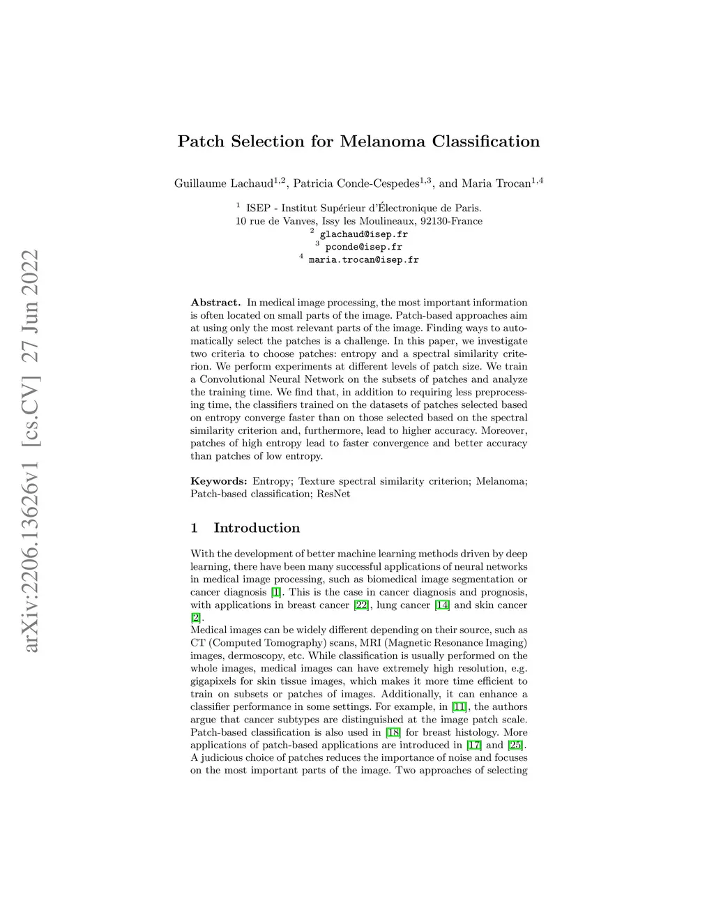 In medical image processing, the most important information is often located on small parts of the image. Patch-based approaches aim at using only the most relevant parts of the image. Finding ways to automatically select the patches is a challenge. In this paper, we investigate two criteria to choose patches: entropy and a spectral similarity criterion. We perform experiments at different levels of patch size. We train a Convolutional Neural Network on the subsets of patches and analyze the training time. We find that, in addition to requiring less preprocessing time, the classifiers trained on the datasets of patches selected based on entropy converge faster than on those selected based on the spectral similarity criterion and, furthermore, lead to higher accuracy. Moreover, patches of high entropy lead to faster convergence and better accuracy than patches of low entropy.