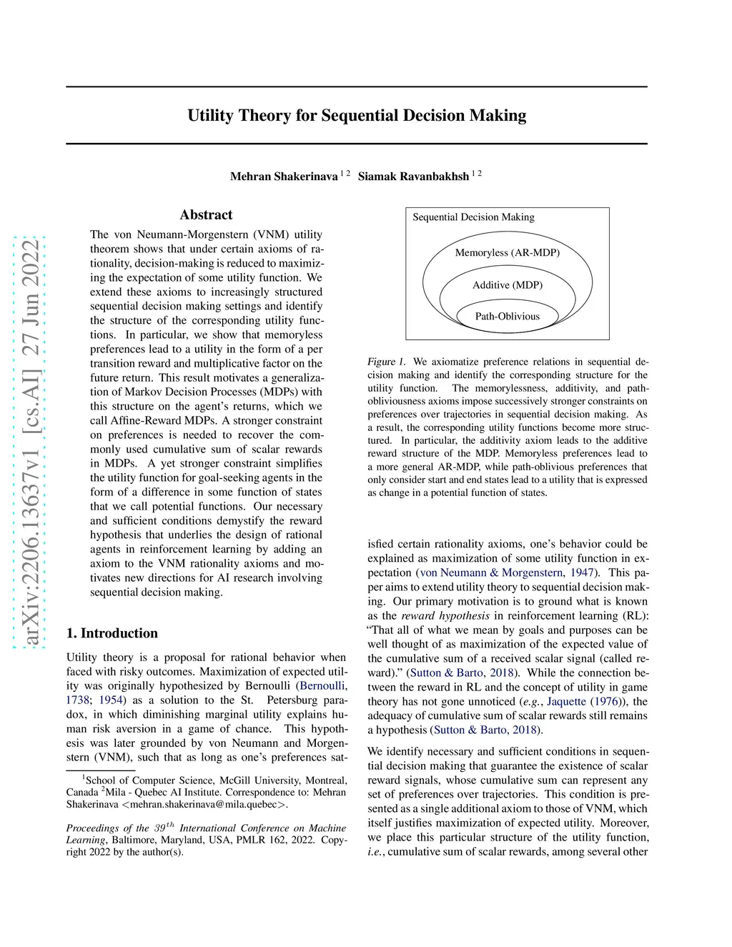 The von Neumann-Morgenstern (VNM) utility theorem shows that under certain axioms of rationality, decision-making is reduced to maximizing the expectation of some utility function. We extend these axioms to increasingly structured sequential decision making settings and identify the structure of the corresponding utility functions. In particular, we show that memoryless preferences lead to a utility in the form of a per transition reward and multiplicative factor on the future return. This result motivates a generalization of Markov Decision Processes (MDPs) with this structure on the agent's returns, which we call Affine-Reward MDPs. A stronger constraint on preferences is needed to recover the commonly used cumulative sum of scalar rewards in MDPs. A yet stronger constraint simplifies the utility function for goal-seeking agents in the form of a difference in some function of states that we call potential functions. Our necessary and sufficient conditions demystify the reward hypothesis that underlies the design of rational agents in reinforcement learning by adding an axiom to the VNM rationality axioms and motivates new directions for AI research involving sequential decision making.