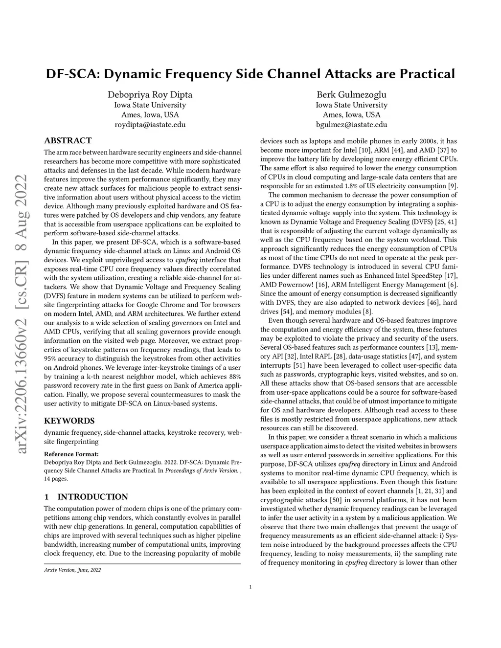 The arm race between hardware security engineers and side-channel researchers has become more competitive with more sophisticated attacks and defenses in the last decade. While modern hardware features improve the system performance significantly, they may create new attack surfaces for malicious people to extract sensitive information about users without physical access to the victim device. Although many previously exploited hardware and OS features were patched by OS developers and chip vendors, any feature that is accessible from userspace applications can be exploited to perform software-based side-channel attacks. In this paper, we present DF-SCA, which is a software-based dynamic frequency side-channel attack on Linux and Android OS devices. We exploit unprivileged access to cpufreq interface that exposes real-time CPU core frequency values directly correlated with the system utilization, creating a reliable side-channel for attackers. We show that Dynamic Voltage and Frequency Scaling (DVFS) feature in modern systems can be utilized to perform website fingerprinting attacks for Google Chrome and Tor browsers on modern Intel, AMD, and ARM architectures. We further extend our analysis to a wide selection of scaling governors on Intel and AMD CPUs, verifying that all scaling governors provide enough information on the visited web page. Moreover, we extract properties of keystroke patterns on frequency readings, that leads to 95% accuracy to distinguish the keystrokes from other activities on Android phones. We leverage inter-keystroke timings of a user by training a k-th nearest neighbor model, which achieves 88% password recovery rate in the first guess on Bank of America application. Finally, we propose several countermeasures to mask the user activity to mitigate DF-SCA on Linux-based systems.