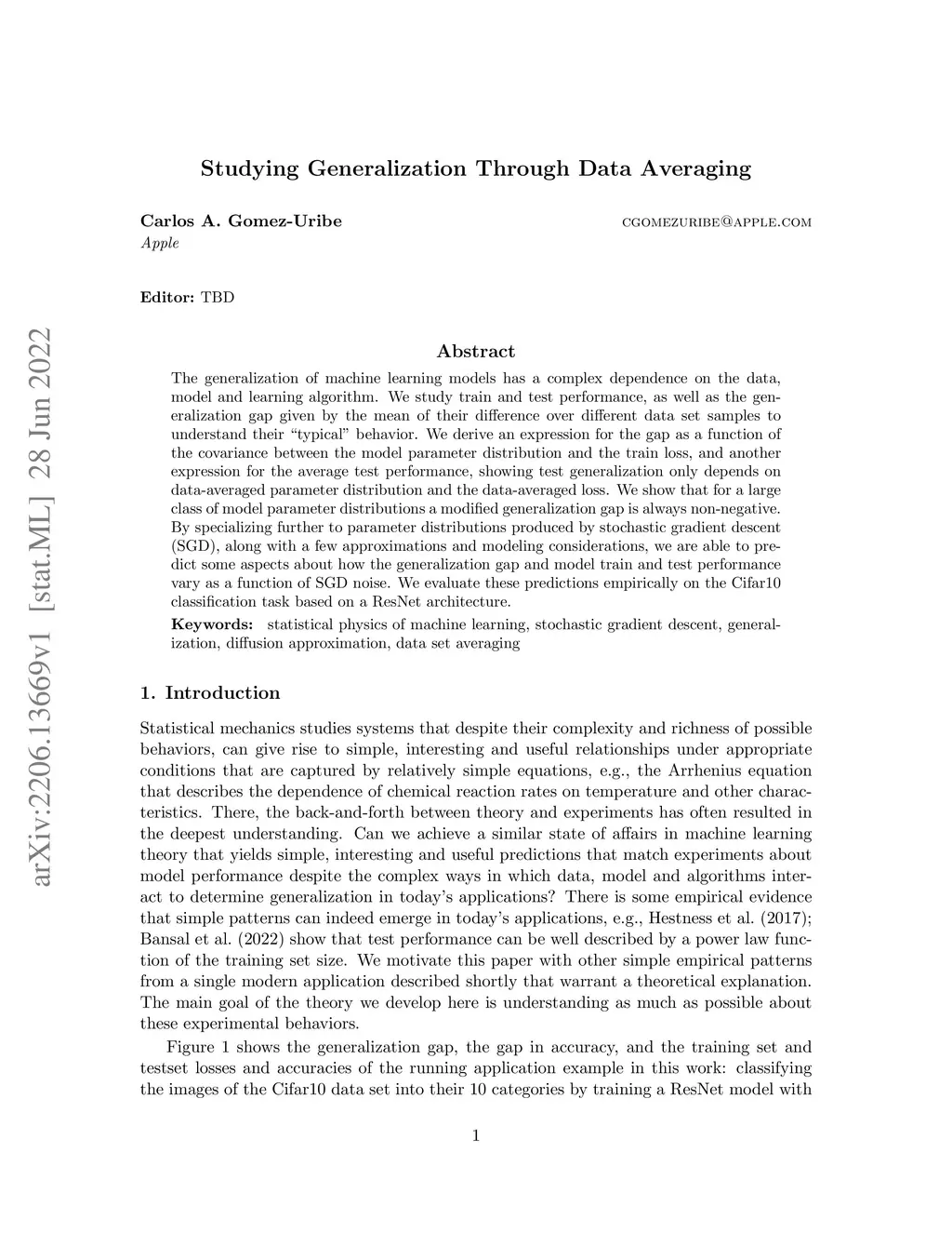 The generalization of machine learning models has a complex dependence on the data, model and learning algorithm. We study train and test performance, as well as the generalization gap given by the mean of their difference over different data set samples to understand their ``typical" behavior. We derive an expression for the gap as a function of the covariance between the model parameter distribution and the train loss, and another expression for the average test performance, showing test generalization only depends on data-averaged parameter distribution and the data-averaged loss. We show that for a large class of model parameter distributions a modified generalization gap is always non-negative. By specializing further to parameter distributions produced by stochastic gradient descent (SGD), along with a few approximations and modeling considerations, we are able to predict some aspects about how the generalization gap and model train and test performance vary as a function of SGD noise. We evaluate these predictions empirically on the Cifar10 classification task based on a ResNet architecture.