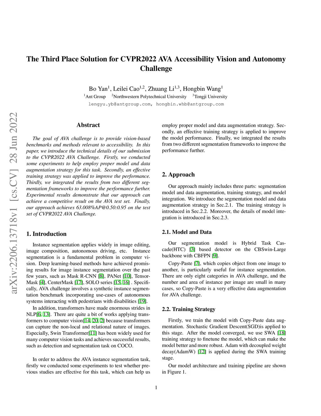 The goal of AVA challenge is to provide vision-based benchmarks and methods relevant to accessibility. In this paper, we introduce the technical details of our submission to the CVPR2022 AVA Challenge. Firstly, we conducted some experiments to help employ proper model and data augmentation strategy for this task. Secondly, an effective training strategy was applied to improve the performance. Thirdly, we integrated the results from two different segmentation frameworks to improve the performance further. Experimental results demonstrate that our approach can achieve a competitive result on the AVA test set. Finally, our approach achieves 63.008\%AP@0.50:0.95 on the test set of CVPR2022 AVA Challenge.