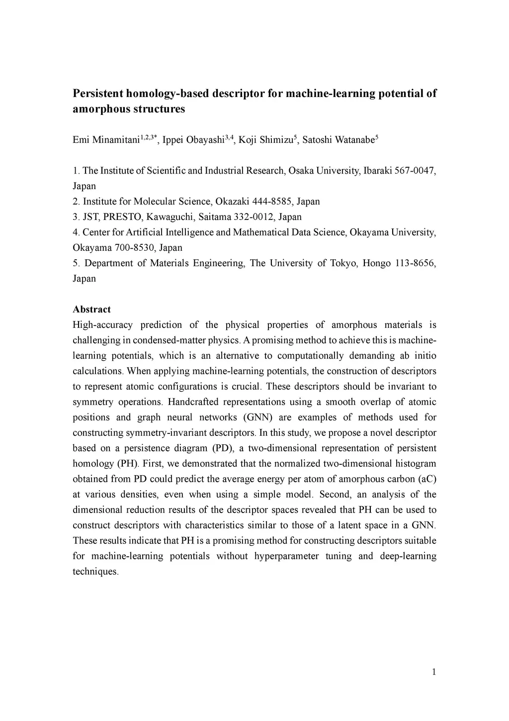 High-accuracy prediction of the physical properties of amorphous materials is challenging in condensed-matter physics. A promising method to achieve this is machine-learning potentials, which is an alternative to computationally demanding ab initio calculations. When applying machine-learning potentials, the construction of descriptors to represent atomic configurations is crucial. These descriptors should be invariant to symmetry operations. Handcrafted representations using a smooth overlap of atomic positions and graph neural networks (GNN) are examples of methods used for constructing symmetry-invariant descriptors. In this study, we propose a novel descriptor based on a persistence diagram (PD), a two-dimensional representation of persistent homology (PH). First, we demonstrated that the normalized two-dimensional histogram obtained from PD could predict the average energy per atom of amorphous carbon (aC) at various densities, even when using a simple model. Second, an analysis of the dimensional reduction results of the descriptor spaces revealed that PH can be used to construct descriptors with characteristics similar to those of a latent space in a GNN. These results indicate that PH is a promising method for constructing descriptors suitable for machine-learning potentials without hyperparameter tuning and deep-learning techniques.