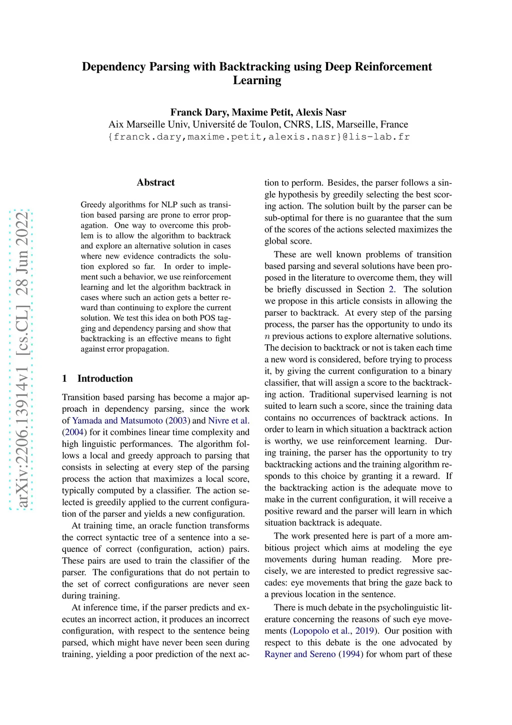 Dependency Parsing with Backtracking using Deep Reinforcement Learning