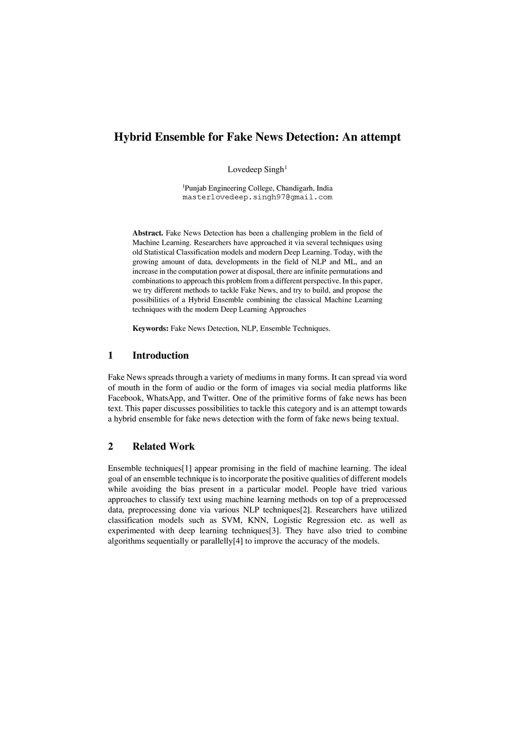 Hybrid Ensemble for Fake News Detection: An attempt
