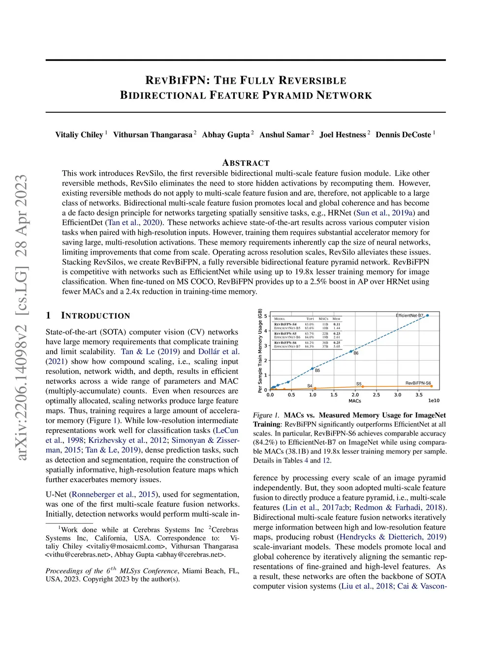 This work introduces RevSilo, the first reversible bidirectional multi-scale feature fusion module. Like other reversible methods, RevSilo eliminates the need to store hidden activations by recomputing them. However, existing reversible methods do not apply to multi-scale feature fusion and are, therefore, not applicable to a large class of networks. Bidirectional multi-scale feature fusion promotes local and global coherence and has become a de facto design principle for networks targeting spatially sensitive tasks, e.g., HRNet (Sun et al., 2019a) and EfficientDet (Tan et al., 2020). These networks achieve state-of-the-art results across various computer vision tasks when paired with high-resolution inputs. However, training them requires substantial accelerator memory for saving large, multi-resolution activations. These memory requirements inherently cap the size of neural networks, limiting improvements that come from scale. Operating across resolution scales, RevSilo alleviates these issues. Stacking RevSilos, we create RevBiFPN, a fully reversible bidirectional feature pyramid network. RevBiFPN is competitive with networks such as EfficientNet while using up to 19.8x lesser training memory for image classification. When fine-tuned on MS COCO, RevBiFPN provides up to a 2.5% boost in AP over HRNet using fewer MACs and a 2.4x reduction in training-time memory.