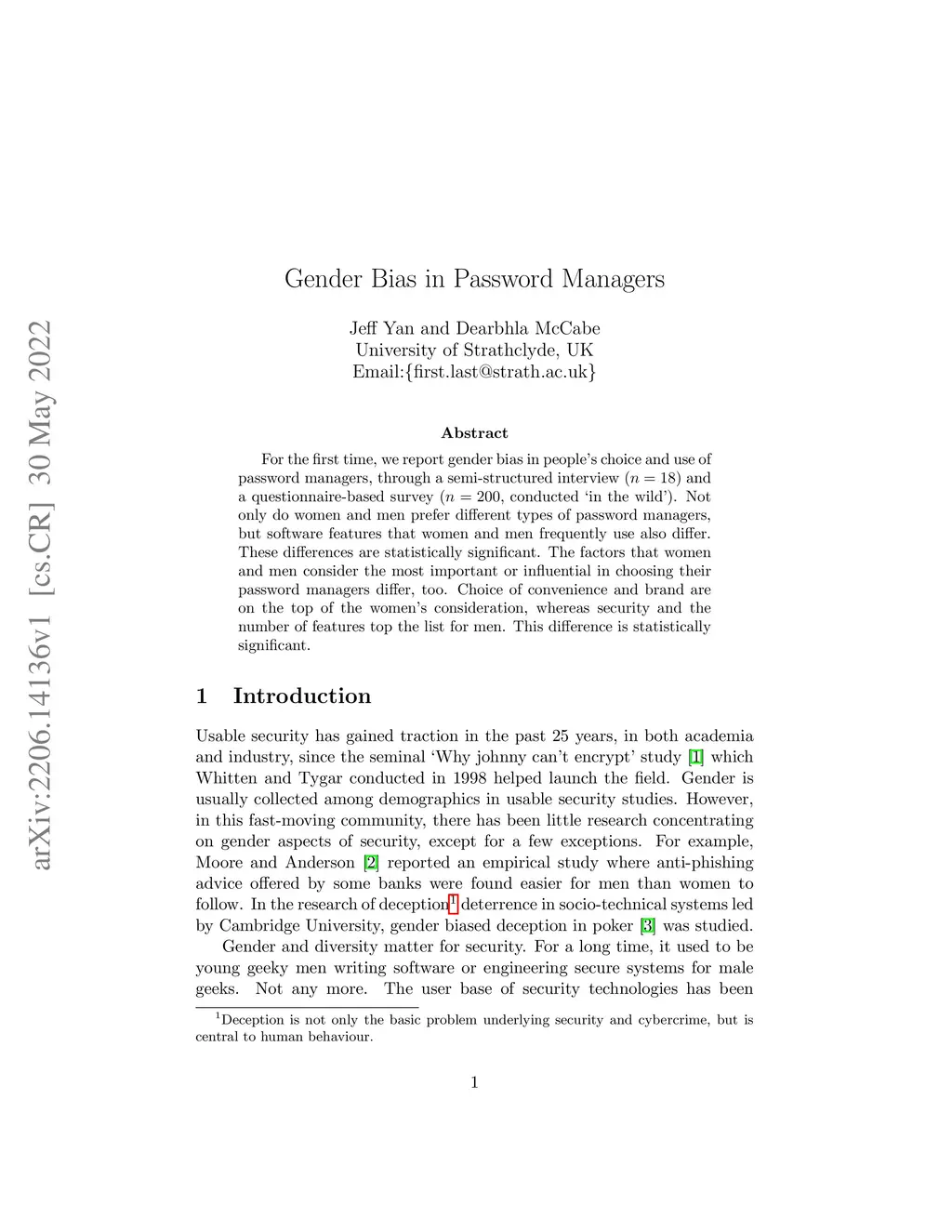 For the first time, we report gender bias in people's choice and use of password managers, through a semi-structured interview () and a questionnaire-based survey (, conducted `in the wild'). Not only do women and men prefer different types of password managers, but software features that women and men frequently use also differ. These differences are statistically significant. The factors that women and men consider the most important or influential in choosing their password managers differ, too. Choice of convenience and brand are on the top of the women's consideration, whereas security and the number of features top the list for men. This difference is statistically significant.