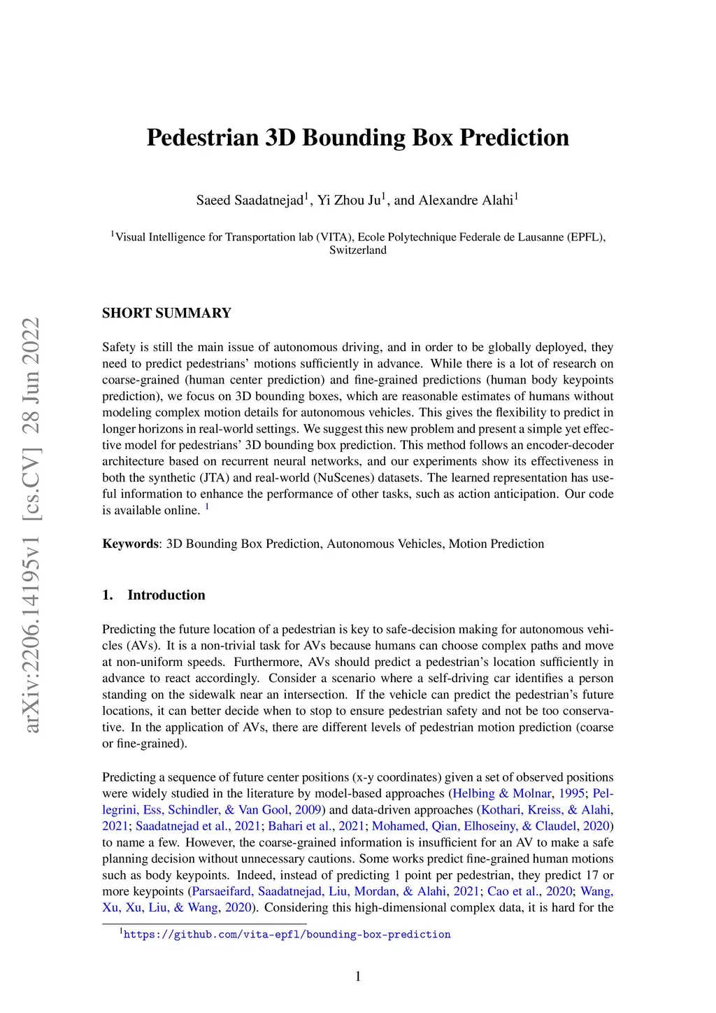 Safety is still the main issue of autonomous driving, and in order to be globally deployed, they need to predict pedestrians' motions sufficiently in advance. While there is a lot of research on coarse-grained (human center prediction) and fine-grained predictions (human body keypoints prediction), we focus on 3D bounding boxes, which are reasonable estimates of humans without modeling complex motion details for autonomous vehicles. This gives the flexibility to predict in longer horizons in real-world settings. We suggest this new problem and present a simple yet effective model for pedestrians' 3D bounding box prediction. This method follows an encoder-decoder architecture based on recurrent neural networks, and our experiments show its effectiveness in both the synthetic (JTA) and real-world (NuScenes) datasets. The learned representation has useful information to enhance the performance of other tasks, such as action anticipation. Our code is available online: https://github.com/vita-epfl/bounding-box-prediction