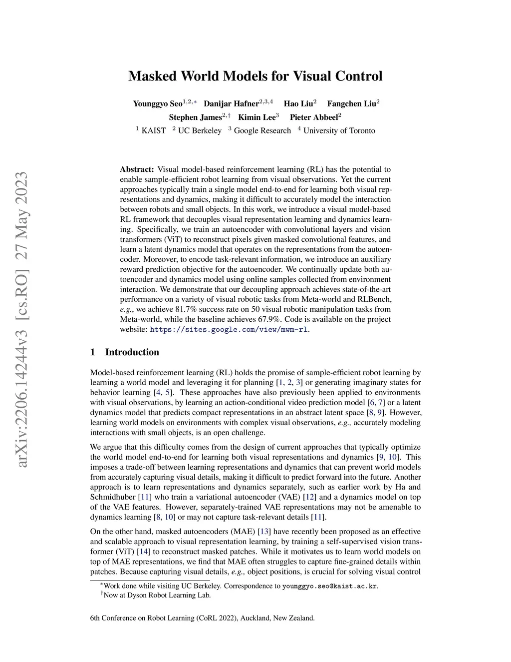 Visual model-based reinforcement learning (RL) has the potential to enable sample-efficient robot learning from visual observations. Yet the current approaches typically train a single model end-to-end for learning both visual representations and dynamics, making it difficult to accurately model the interaction between robots and small objects. In this work, we introduce a visual model-based RL framework that decouples visual representation learning and dynamics learning. Specifically, we train an autoencoder with convolutional layers and vision transformers (ViT) to reconstruct pixels given masked convolutional features, and learn a latent dynamics model that operates on the representations from the autoencoder. Moreover, to encode task-relevant information, we introduce an auxiliary reward prediction objective for the autoencoder. We continually update both autoencoder and dynamics model using online samples collected from environment interaction. We demonstrate that our decoupling approach achieves state-of-the-art performance on a variety of visual robotic tasks from Meta-world and RLBench, e.g., we achieve 81.7% success rate on 50 visual robotic manipulation tasks from Meta-world, while the baseline achieves 67.9%. Code is available on the project website: https://sites.google.com/view/mwm-rl.