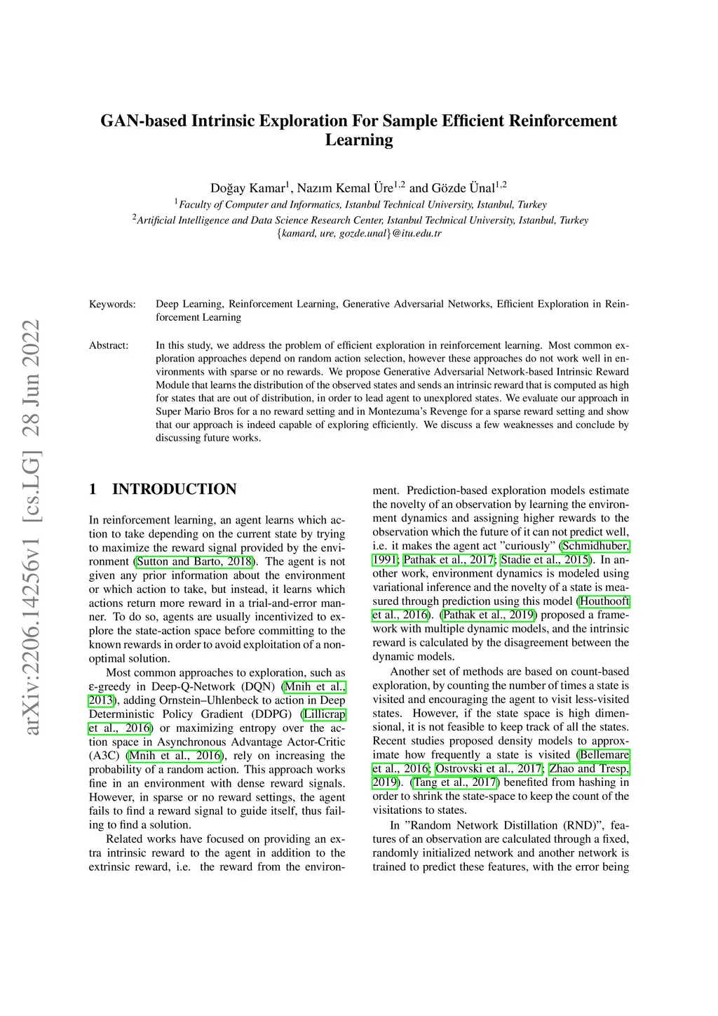 In this study, we address the problem of efficient exploration in reinforcement learning. Most common exploration approaches depend on random action selection, however these approaches do not work well in environments with sparse or no rewards. We propose Generative Adversarial Network-based Intrinsic Reward Module that learns the distribution of the observed states and sends an intrinsic reward that is computed as high for states that are out of distribution, in order to lead agent to unexplored states. We evaluate our approach in Super Mario Bros for a no reward setting and in Montezuma's Revenge for a sparse reward setting and show that our approach is indeed capable of exploring efficiently. We discuss a few weaknesses and conclude by discussing future works.