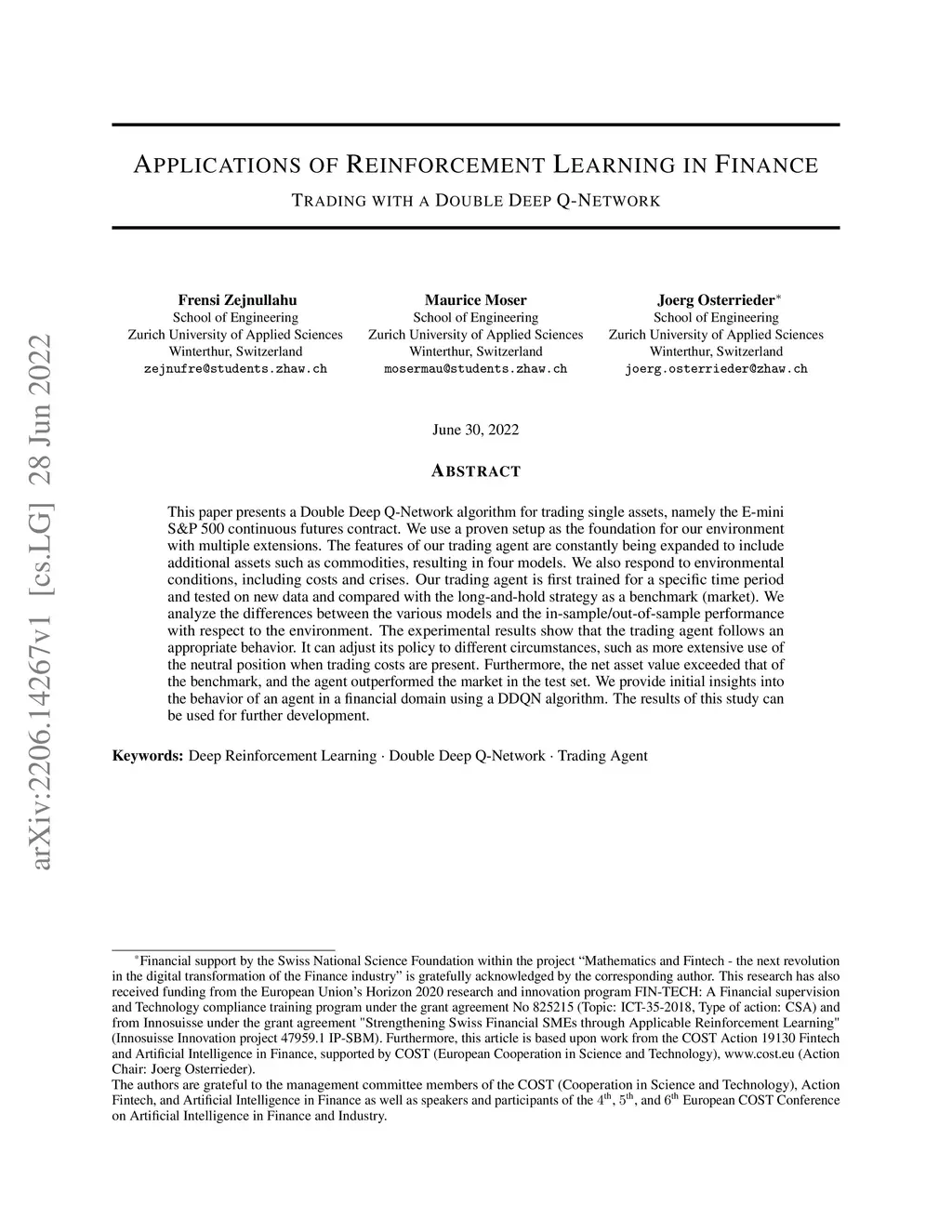 This paper presents a Double Deep Q-Network algorithm for trading single assets, namely the E-mini S&P 500 continuous futures contract. We use a proven setup as the foundation for our environment with multiple extensions. The features of our trading agent are constantly being expanded to include additional assets such as commodities, resulting in four models. We also respond to environmental conditions, including costs and crises. Our trading agent is first trained for a specific time period and tested on new data and compared with the long-and-hold strategy as a benchmark (market). We analyze the differences between the various models and the in-sample/out-of-sample performance with respect to the environment. The experimental results show that the trading agent follows an appropriate behavior. It can adjust its policy to different circumstances, such as more extensive use of the neutral position when trading costs are present. Furthermore, the net asset value exceeded that of the benchmark, and the agent outperformed the market in the test set. We provide initial insights into the behavior of an agent in a financial domain using a DDQN algorithm. The results of this study can be used for further development.