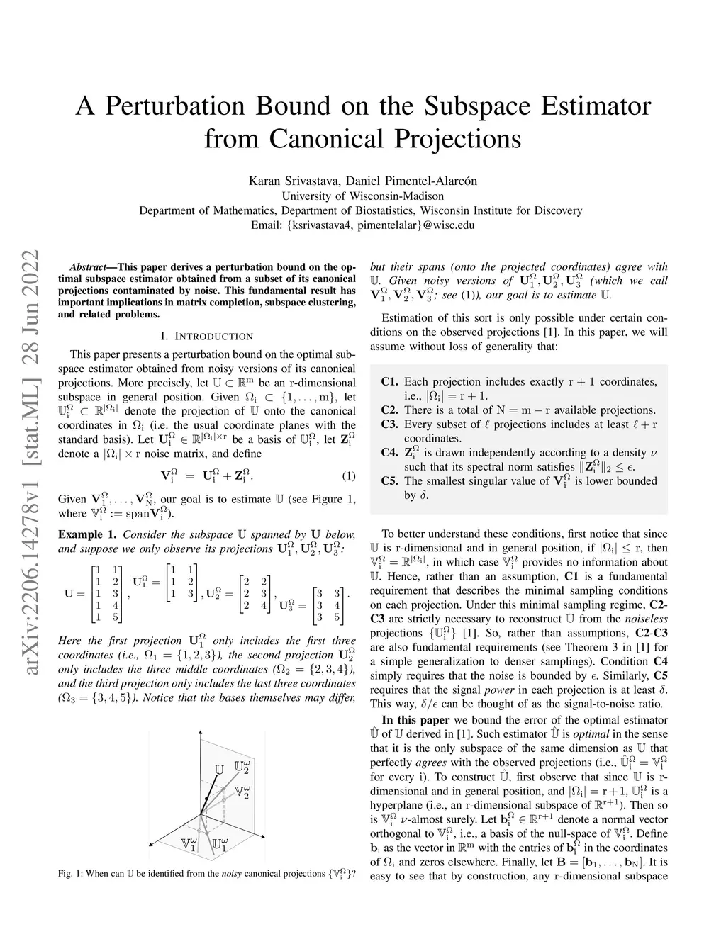 This paper derives a perturbation bound on the optimal subspace estimator obtained from a subset of its canonical projections contaminated by noise. This fundamental result has important implications in matrix completion, subspace clustering, and related problems.