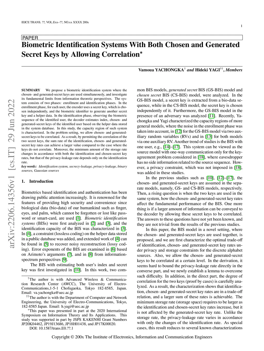 Biometric Identification Systems With Both Chosen and Generated Secret