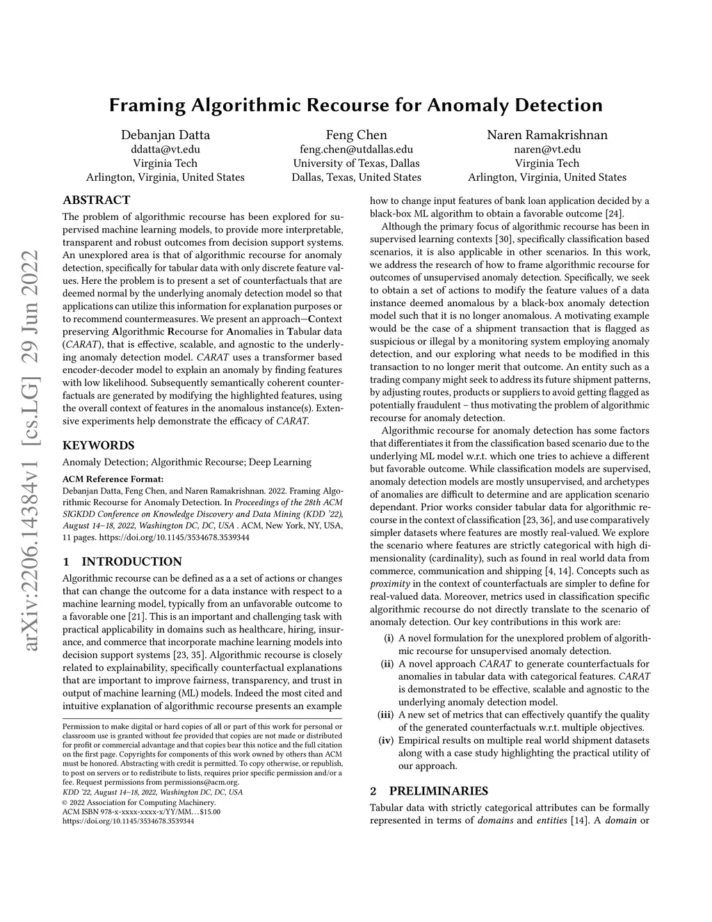 The problem of algorithmic recourse has been explored for supervised machine learning models, to provide more interpretable, transparent and robust outcomes from decision support systems. An unexplored area is that of algorithmic recourse for anomaly detection, specifically for tabular data with only discrete feature values. Here the problem is to present a set of counterfactuals that are deemed normal by the underlying anomaly detection model so that applications can utilize this information for explanation purposes or to recommend countermeasures. We present an approach -- Context preserving Algorithmic Recourse for Anomalies in Tabular data (CARAT), that is effective, scalable, and agnostic to the underlying anomaly detection model. CARAT uses a transformer based encoder-decoder model to explain an anomaly by finding features with low likelihood. Subsequently semantically coherent counterfactuals are generated by modifying the highlighted features, using the overall context of features in the anomalous instance(s). Extensive experiments help demonstrate the efficacy of CARAT.