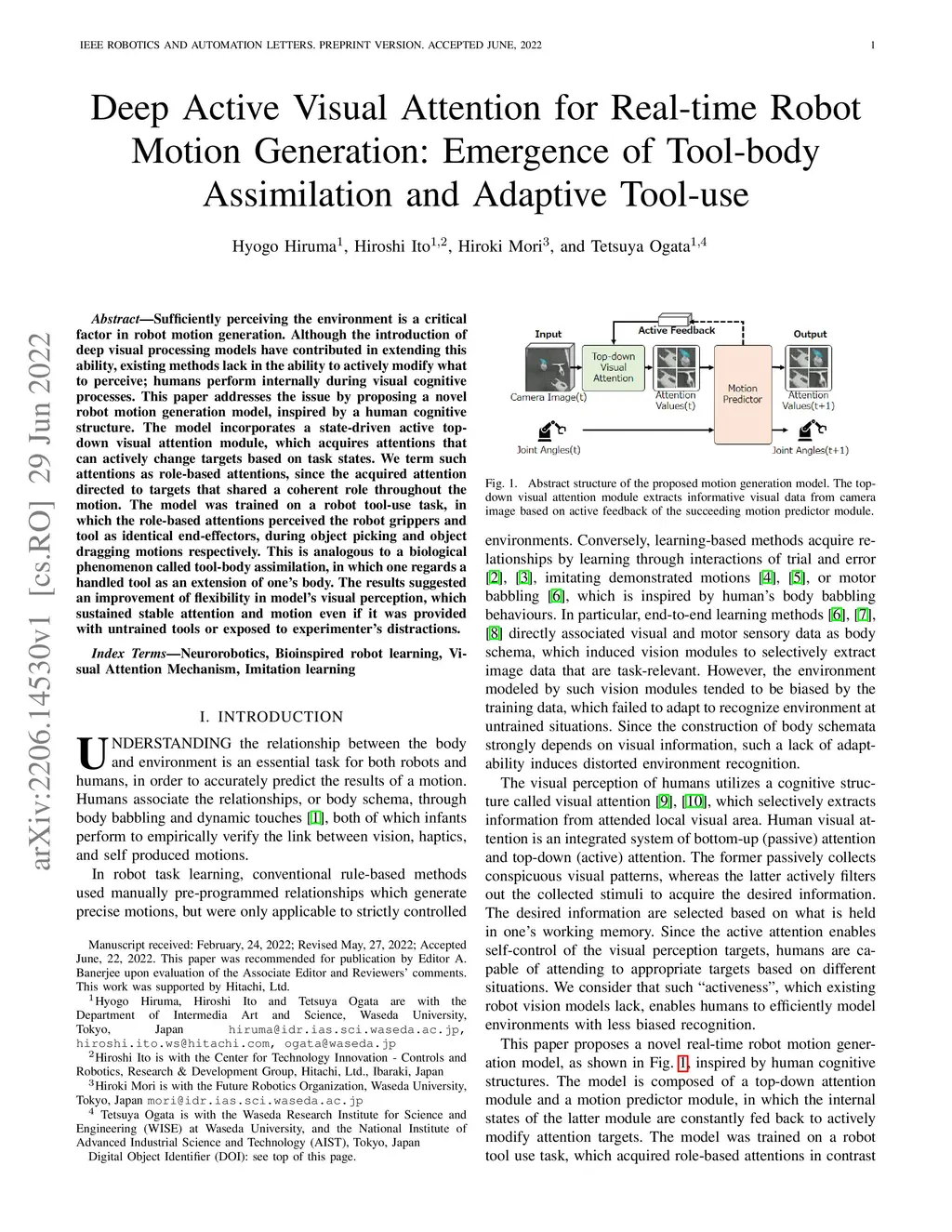 Sufficiently perceiving the environment is a critical factor in robot motion generation. Although the introduction of deep visual processing models have contributed in extending this ability, existing methods lack in the ability to actively modify what to perceive; humans perform internally during visual cognitive processes. This paper addresses the issue by proposing a novel robot motion generation model, inspired by a human cognitive structure. The model incorporates a state-driven active top-down visual attention module, which acquires attentions that can actively change targets based on task states. We term such attentions as role-based attentions, since the acquired attention directed to targets that shared a coherent role throughout the motion. The model was trained on a robot tool-use task, in which the role-based attentions perceived the robot grippers and tool as identical end-effectors, during object picking and object dragging motions respectively. This is analogous to a biological phenomenon called tool-body assimilation, in which one regards a handled tool as an extension of one's body. The results suggested an improvement of flexibility in model's visual perception, which sustained stable attention and motion even if it was provided with untrained tools or exposed to experimenter's distractions.