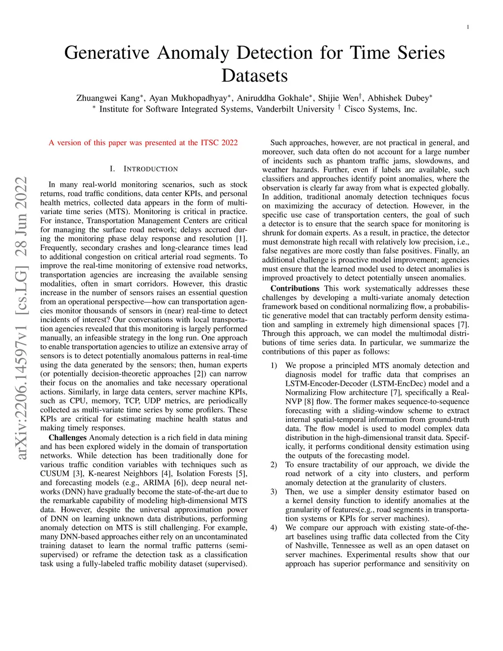 Traffic congestion anomaly detection is of paramount importance in intelligent traffic systems. The goals of transportation agencies are two-fold: to monitor the general traffic conditions in the area of interest and to locate road segments under abnormal congestion states. Modeling congestion patterns can achieve these goals for citywide roadways, which amounts to learning the distribution of multivariate time series (MTS). However, existing works are either not scalable or unable to capture the spatial-temporal information in MTS simultaneously. To this end, we propose a principled and comprehensive framework consisting of a data-driven generative approach that can perform tractable density estimation for detecting traffic anomalies. Our approach first clusters segments in the feature space and then uses conditional normalizing flow to identify anomalous temporal snapshots at the cluster level in an unsupervised setting. Then, we identify anomalies at the segment level by using a kernel density estimator on the anomalous cluster. Extensive experiments on synthetic datasets show that our approach significantly outperforms several state-of-the-art congestion anomaly detection and diagnosis methods in terms of Recall and F1-Score. We also use the generative model to sample labeled data, which can train classifiers in a supervised setting, alleviating the lack of labeled data for anomaly detection in sparse settings.