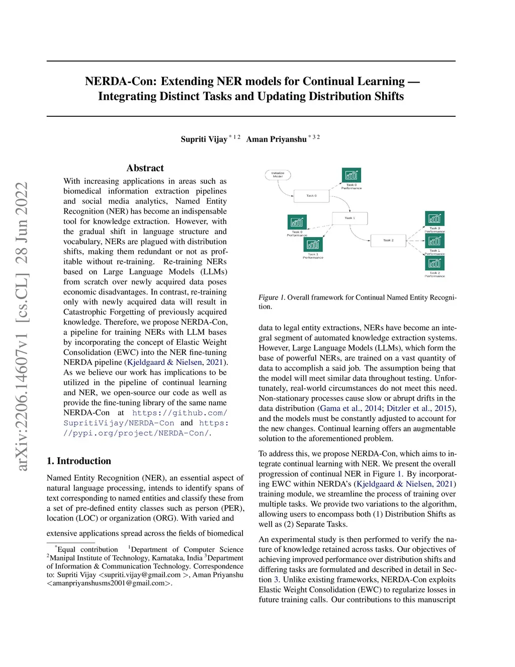 With increasing applications in areas such as biomedical information extraction pipelines and social media analytics, Named Entity Recognition (NER) has become an indispensable tool for knowledge extraction. However, with the gradual shift in language structure and vocabulary, NERs are plagued with distribution shifts, making them redundant or not as profitable without re-training. Re-training NERs based on Large Language Models (LLMs) from scratch over newly acquired data poses economic disadvantages. In contrast, re-training only with newly acquired data will result in Catastrophic Forgetting of previously acquired knowledge. Therefore, we propose NERDA-Con, a pipeline for training NERs with LLM bases by incorporating the concept of Elastic Weight Consolidation (EWC) into the NER fine-tuning NERDA pipeline. As we believe our work has implications to be utilized in the pipeline of continual learning and NER, we open-source our code as well as provide the fine-tuning library of the same name NERDA-Con at https://github.com/SupritiVijay/NERDA-Con and https://pypi.org/project/NERDA-Con/.