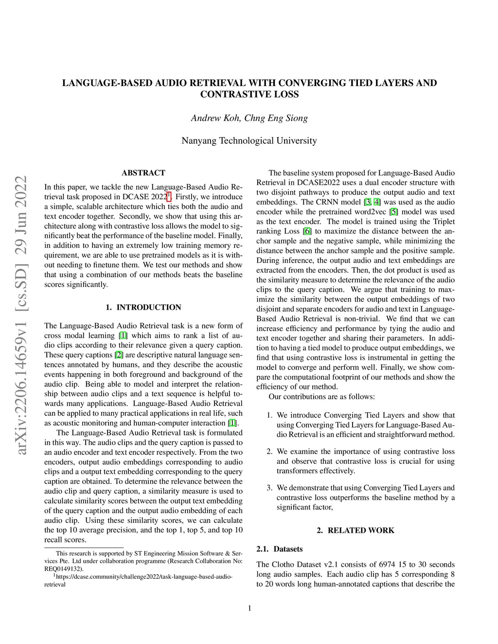 In this paper, we tackle the new Language-Based Audio Retrieval task proposed in DCASE 2022. Firstly, we introduce a simple, scalable architecture which ties both the audio and text encoder together. Secondly, we show that using this architecture along with contrastive loss allows the model to significantly beat the performance of the baseline model. Finally, in addition to having an extremely low training memory requirement, we are able to use pretrained models as it is without needing to finetune them. We test our methods and show that using a combination of our methods beats the baseline scores significantly.