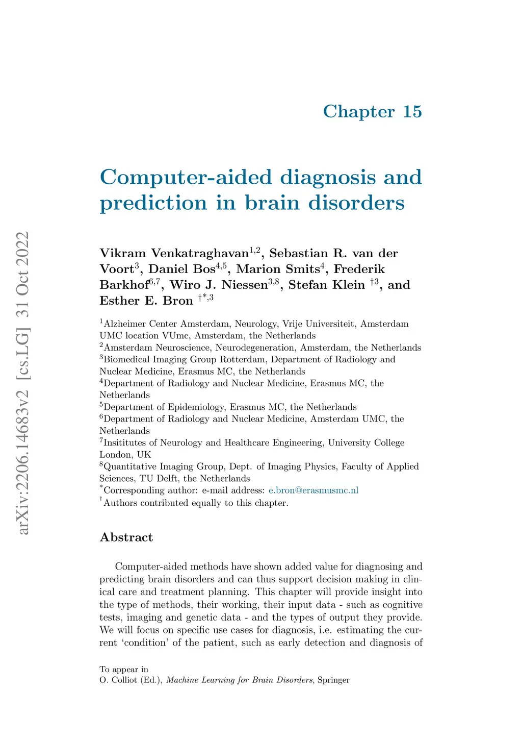 Computer-aided methods have shown added value for diagnosing and predicting brain disorders and can thus support decision making in clinical care and treatment planning. This chapter will provide insight into the type of methods, their working, their input data - such as cognitive tests, imaging and genetic data - and the types of output they provide. We will focus on specific use cases for diagnosis, i.e. estimating the current 'condition' of the patient, such as early detection and diagnosis of dementia, differential diagnosis of brain tumours, and decision making in stroke. Regarding prediction, i.e. estimation of the future 'condition' of the patient, we will zoom in on use cases such as predicting the disease course in multiple sclerosis and predicting patient outcomes after treatment in brain cancer. Furthermore, based on these use cases, we will assess the current state-of-the-art methodology and highlight current efforts on benchmarking of these methods and the importance of open science therein. Finally, we assess the current clinical impact of computer-aided methods and discuss the required next steps to increase clinical impact.