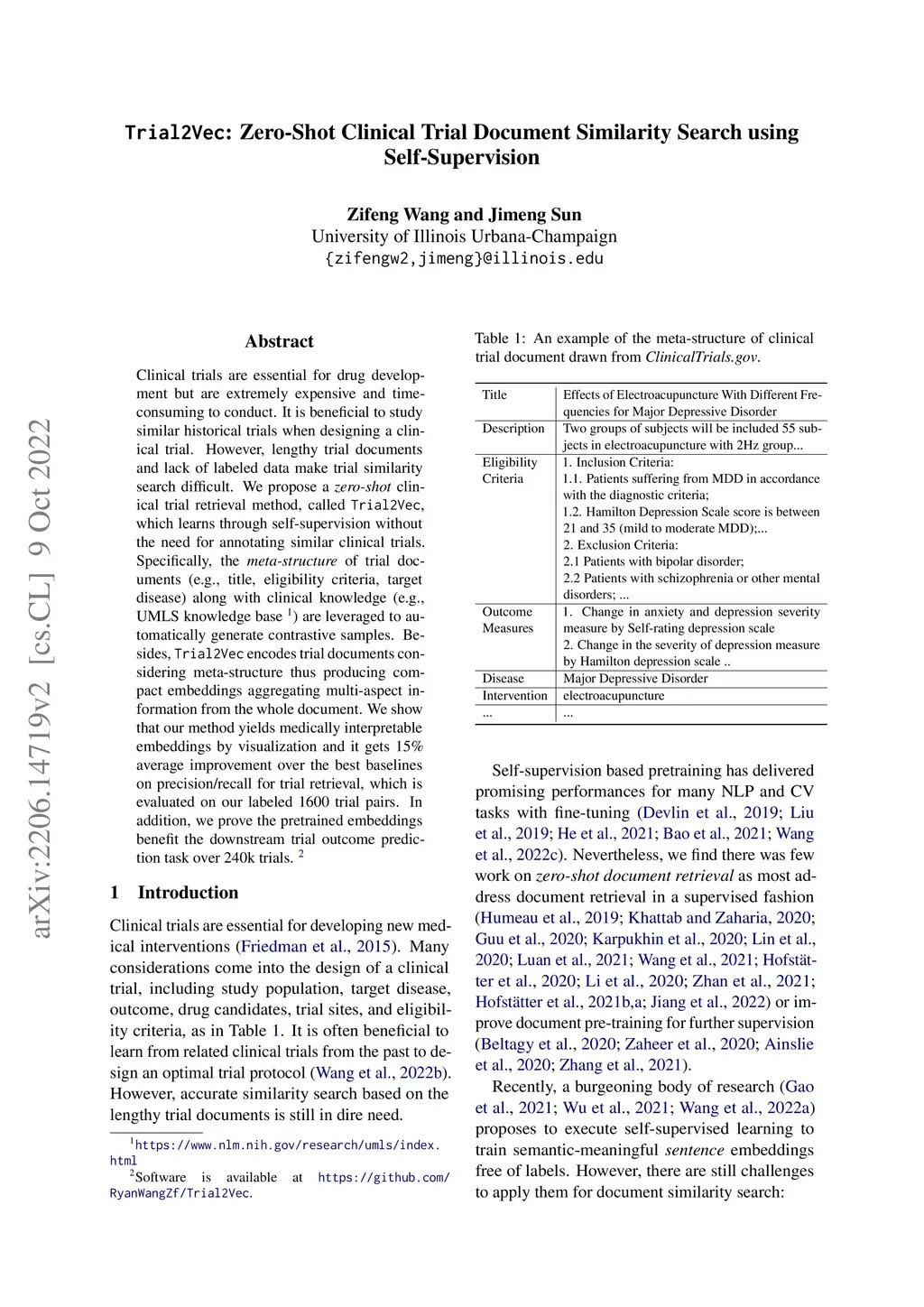 Clinical trials are essential for drug development but are extremely expensive and time-consuming to conduct. It is beneficial to study similar historical trials when designing a clinical trial. However, lengthy trial documents and lack of labeled data make trial similarity search difficult. We propose a zero-shot clinical trial retrieval method, Trial2Vec, which learns through self-supervision without annotating similar clinical trials. Specifically, the meta-structure of trial documents (e.g., title, eligibility criteria, target disease) along with clinical knowledge (e.g., UMLS knowledge base https://www.nlm.nih.gov/research/umls/index.html) are leveraged to automatically generate contrastive samples. Besides, Trial2Vec encodes trial documents considering meta-structure thus producing compact embeddings aggregating multi-aspect information from the whole document. We show that our method yields medically interpretable embeddings by visualization and it gets a 15% average improvement over the best baselines on precision/recall for trial retrieval, which is evaluated on our labeled 1600 trial pairs. In addition, we prove the pre-trained embeddings benefit the downstream trial outcome prediction task over 240k trials. Software ias available at https://github.com/RyanWangZf/Trial2Vec.