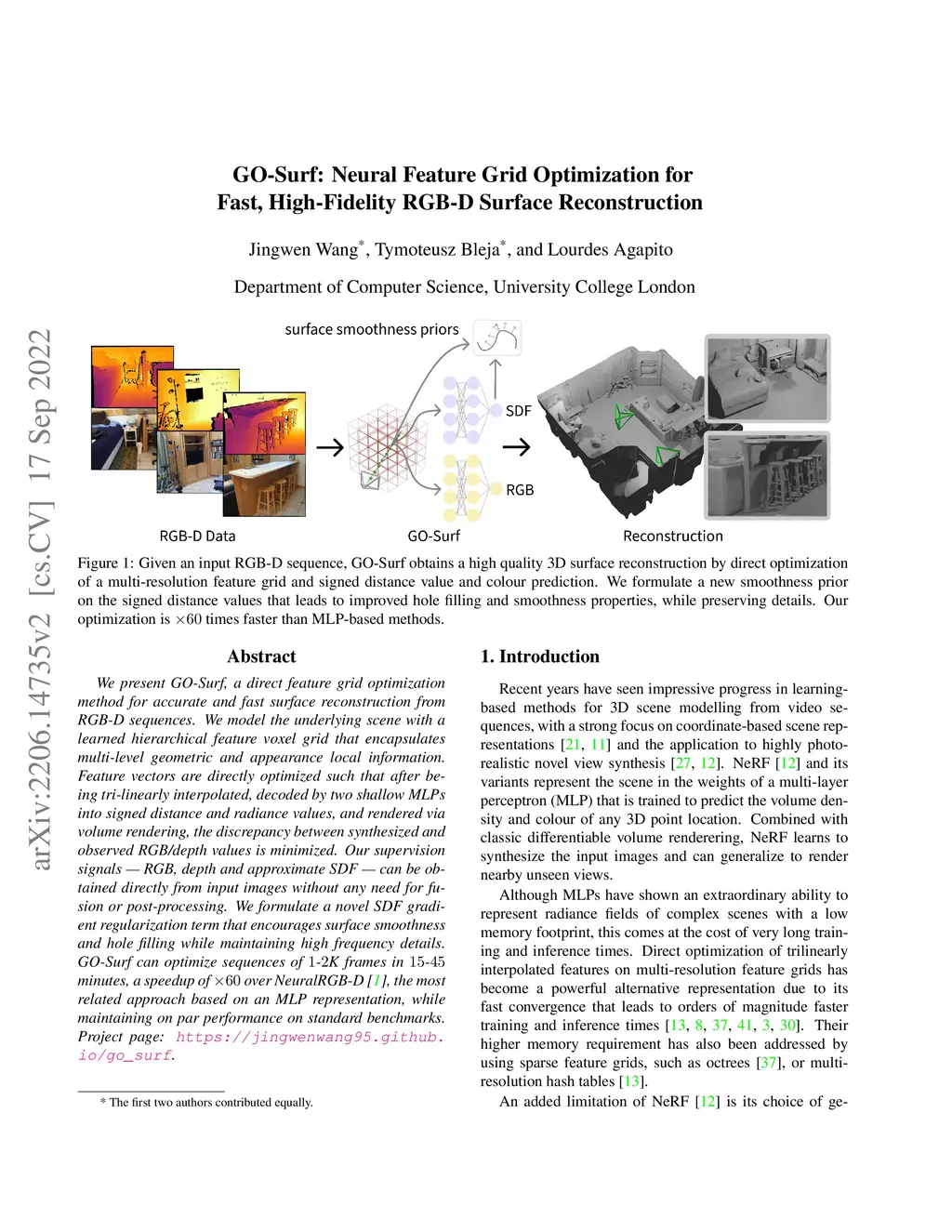 GO-Surf: Neural Feature Grid Optimization for Fast, High-Fidelity RGB-D Surface Reconstruction
