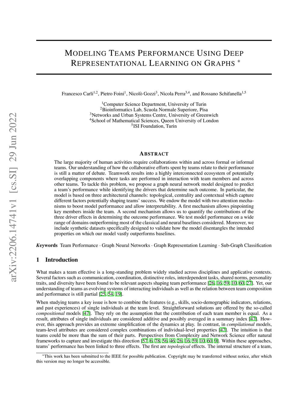The large majority of human activities require collaborations within and across formal or informal teams. Our understanding of how the collaborative efforts spent by teams relate to their performance is still a matter of debate. Teamwork results in a highly interconnected ecosystem of potentially overlapping components where tasks are performed in interaction with team members and across other teams. To tackle this problem, we propose a graph neural network model designed to predict a team's performance while identifying the drivers that determine such an outcome. In particular, the model is based on three architectural channels: topological, centrality, and contextual which capture different factors potentially shaping teams' success. We endow the model with two attention mechanisms to boost model performance and allow interpretability. A first mechanism allows pinpointing key members inside the team. A second mechanism allows us to quantify the contributions of the three driver effects in determining the outcome performance. We test model performance on a wide range of domains outperforming most of the classical and neural baselines considered. Moreover, we include synthetic datasets specifically designed to validate how the model disentangles the intended properties on which our model vastly outperforms baselines.