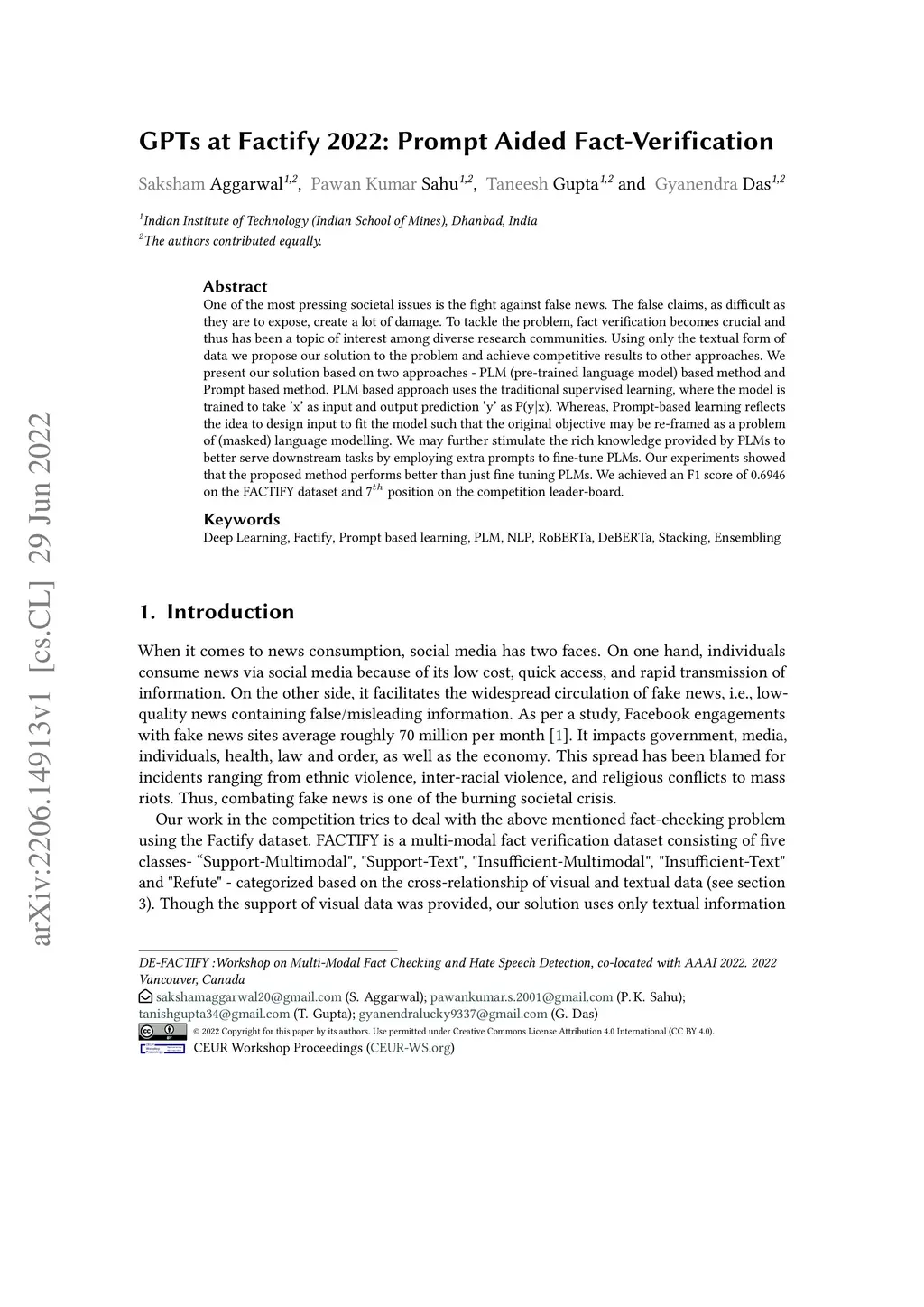 GPTs at Factify 2022: Prompt Aided Fact-Verification
