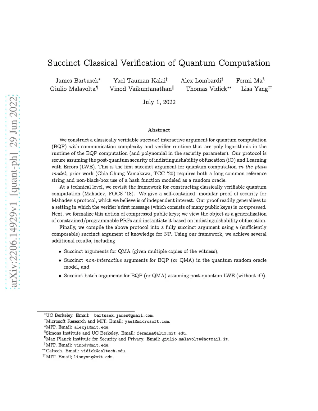 We construct a classically verifiable succinct interactive argument for quantum computation (BQP) with communication complexity and verifier runtime that are poly-logarithmic in the runtime of the BQP computation (and polynomial in the security parameter). Our protocol is secure assuming the post-quantum security of indistinguishability obfuscation (iO) and Learning with Errors (LWE). This is the first succinct argument for quantum computation in the plain model; prior work (Chia-Chung-Yamakawa, TCC '20) requires both a long common reference string and non-black-box use of a hash function modeled as a random oracle. At a technical level, we revisit the framework for constructing classically verifiable quantum computation (Mahadev, FOCS '18). We give a self-contained, modular proof of security for Mahadev's protocol, which we believe is of independent interest. Our proof readily generalizes to a setting in which the verifier's first message (which consists of many public keys) is compressed. Next, we formalize this notion of compressed public keys; we view the object as a generalization of constrained/programmable PRFs and instantiate it based on indistinguishability obfuscation. Finally, we compile the above protocol into a fully succinct argument using a (sufficiently composable) succinct argument of knowledge for NP. Using our framework, we achieve several additional results, including - Succinct arguments for QMA (given multiple copies of the witness), - Succinct non-interactive arguments for BQP (or QMA) in the quantum random oracle model, and - Succinct batch arguments for BQP (or QMA) assuming post-quantum LWE (without iO).